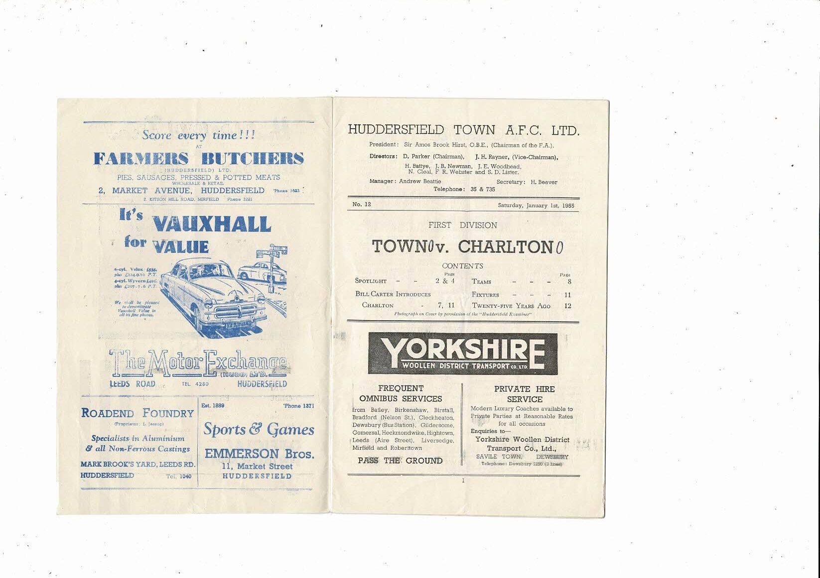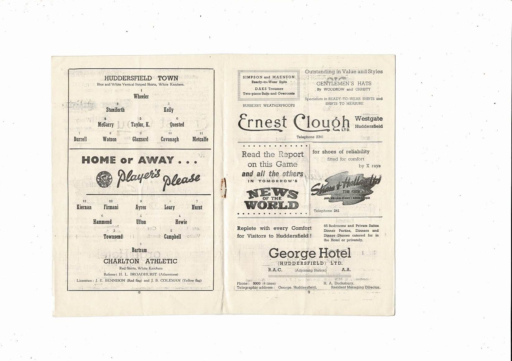 1954/55 Huddersfield Town v Charlton Athletic Football Programme