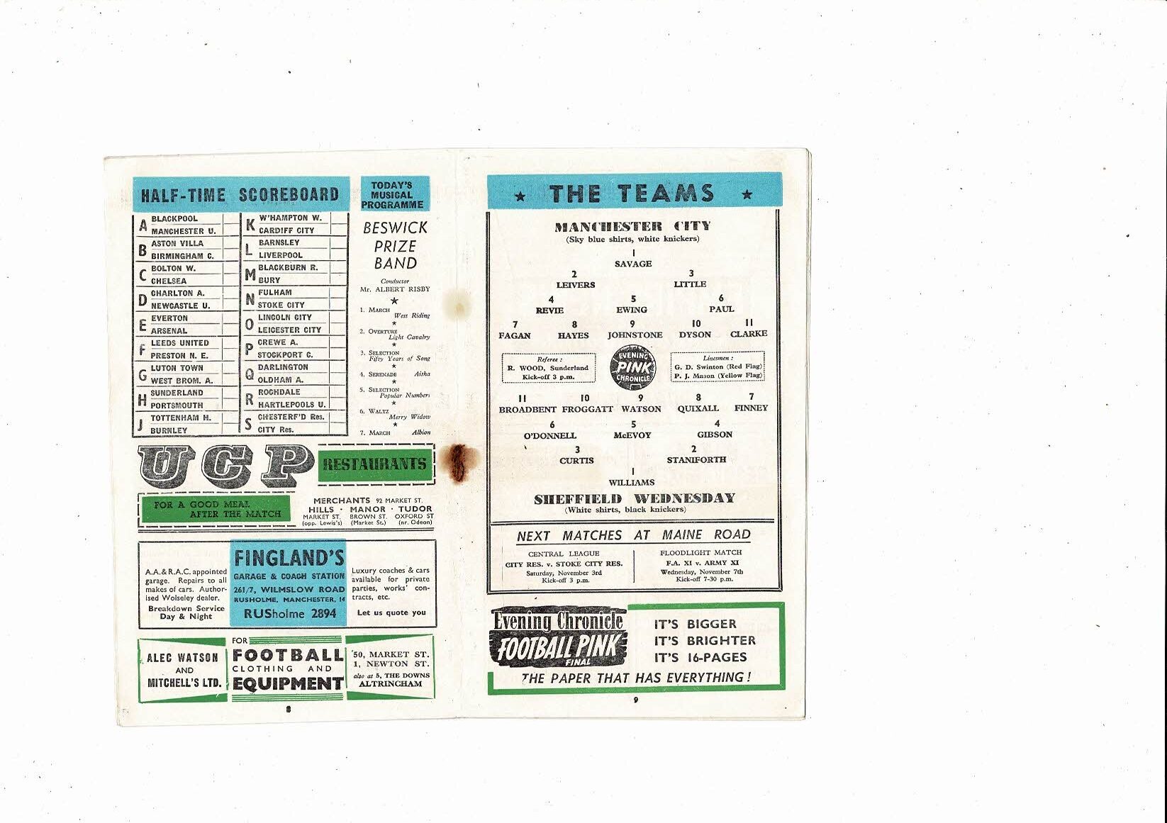 1956/57 Manchester City v Sheffield Wednesday Football Programme