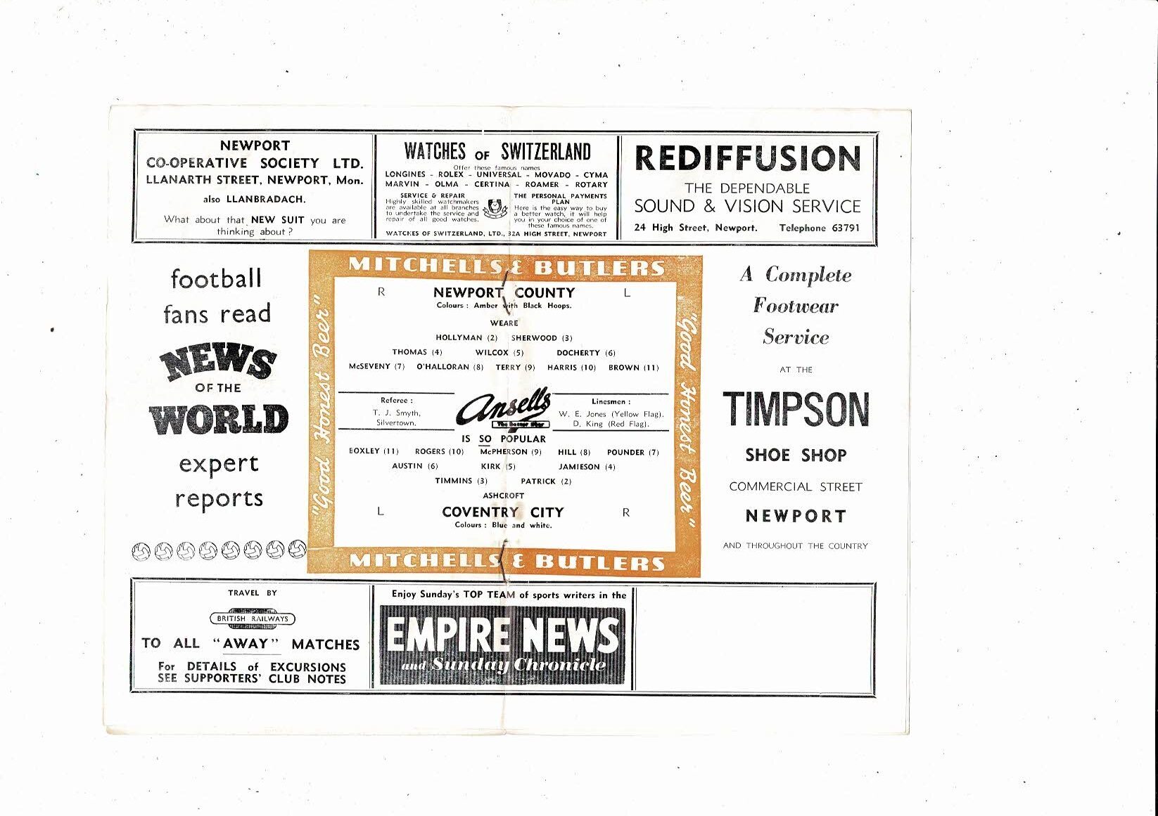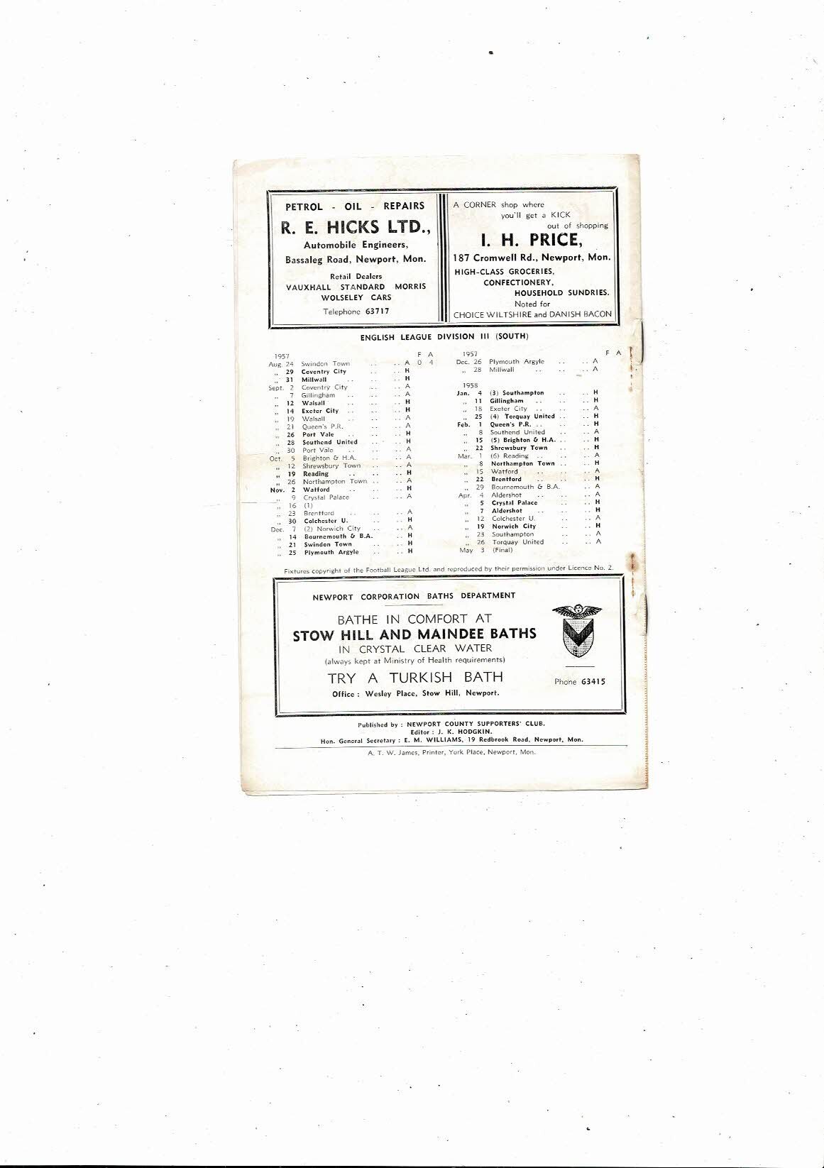 1957/58 Newport County v Coventry City Football Programme