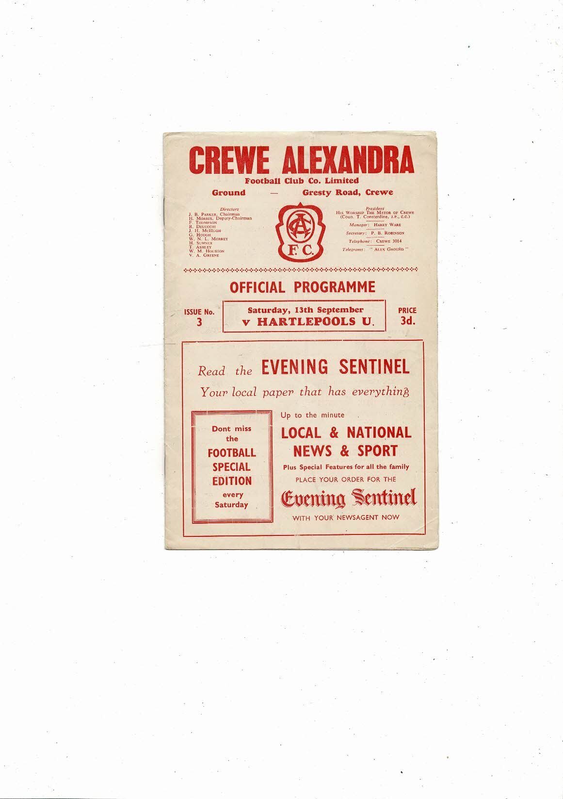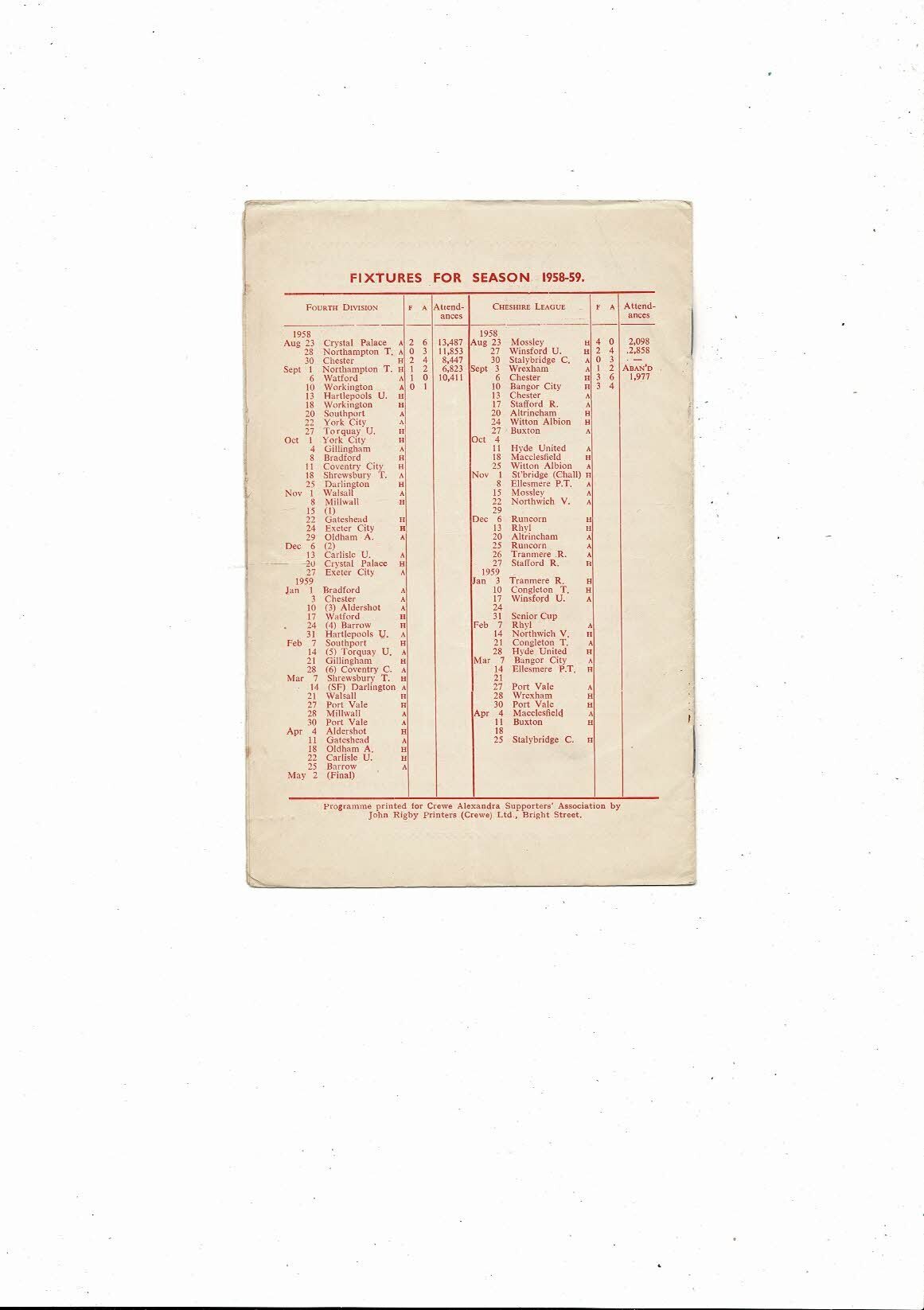 1958/59 Crewe Alexandra v Hartlepool United Football Programme
