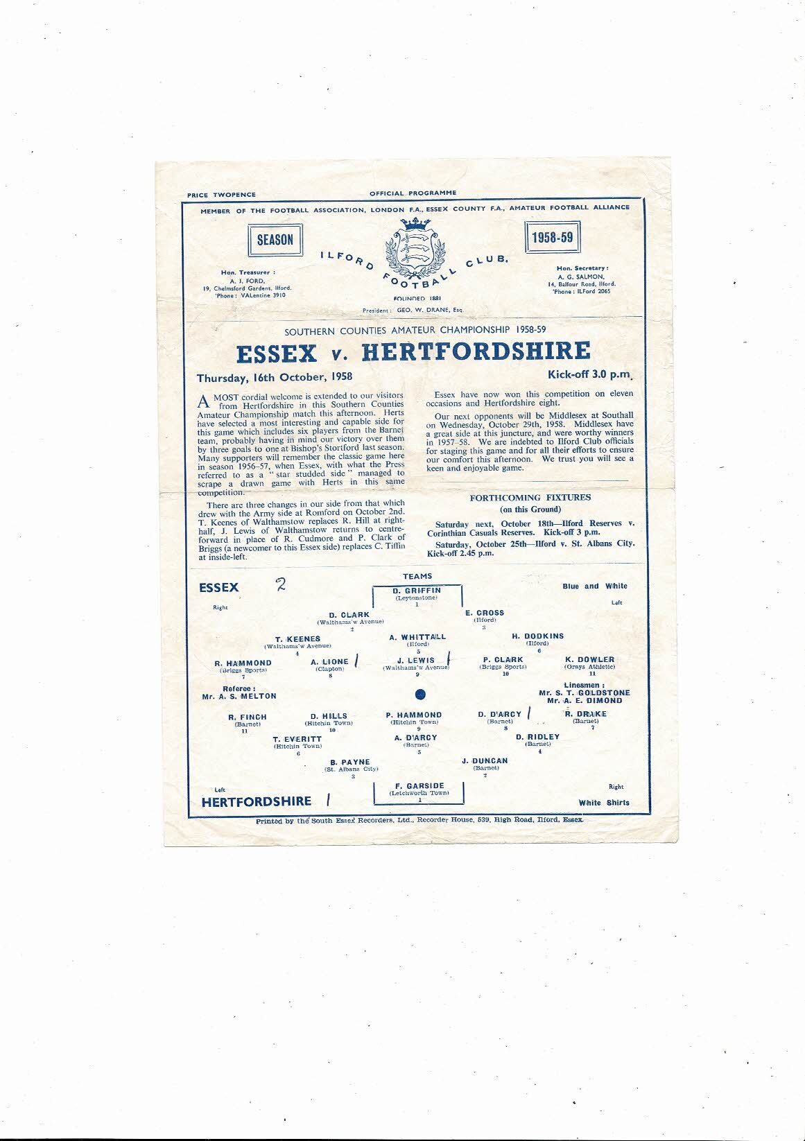 1958/59 Essex v Hertfordshire South East Amateur Championship Football Programme