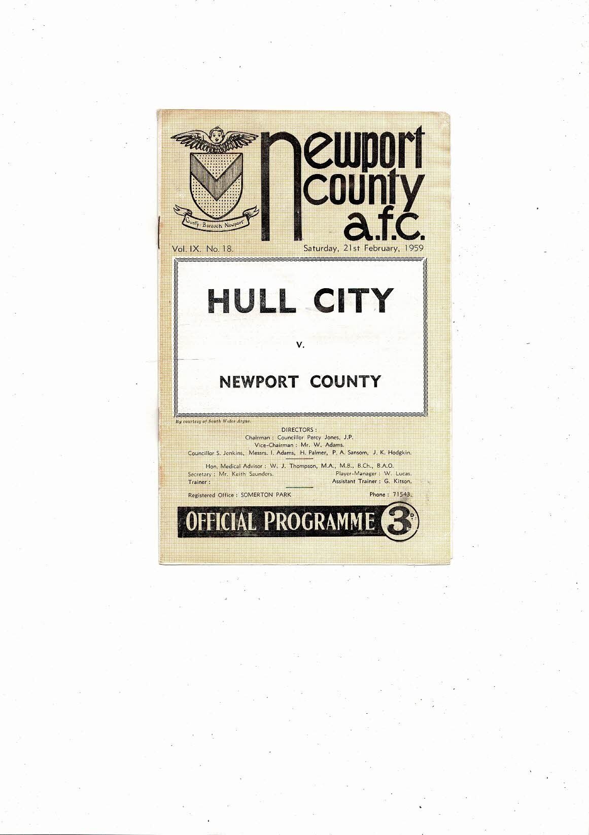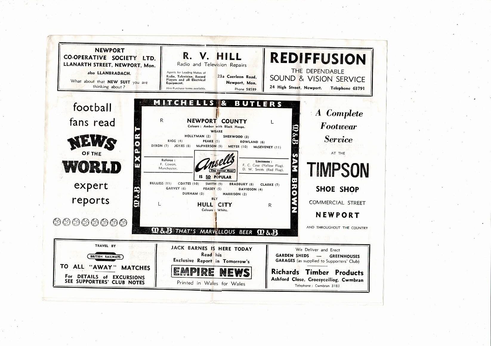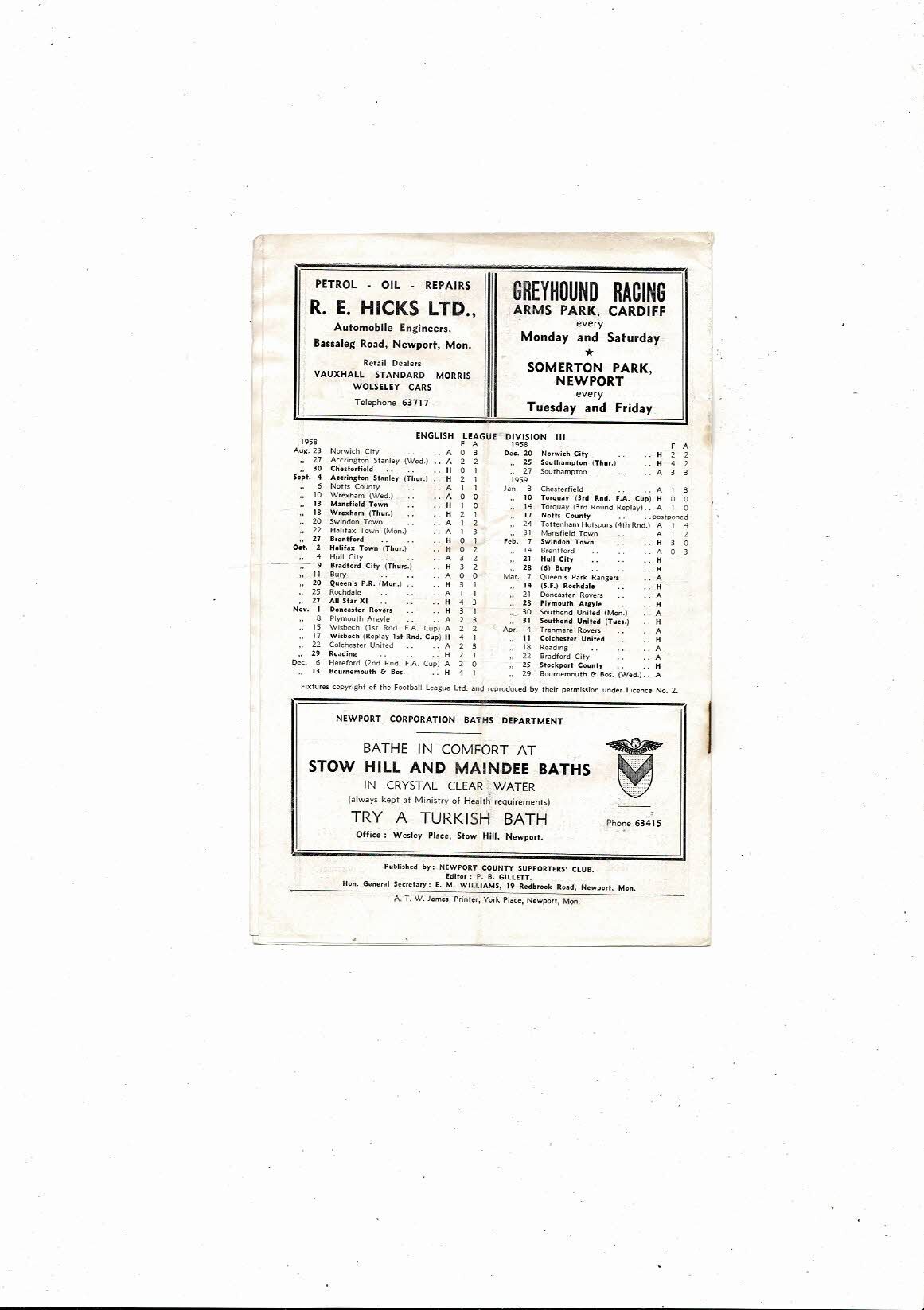 1958/59 Newport County v Hull City Football Programme