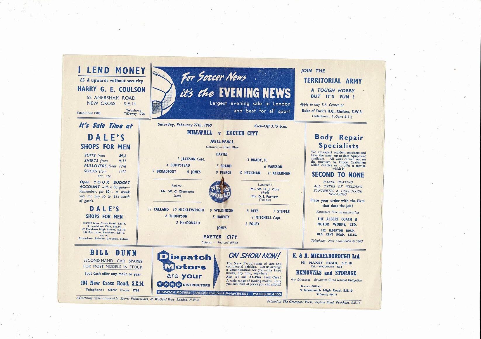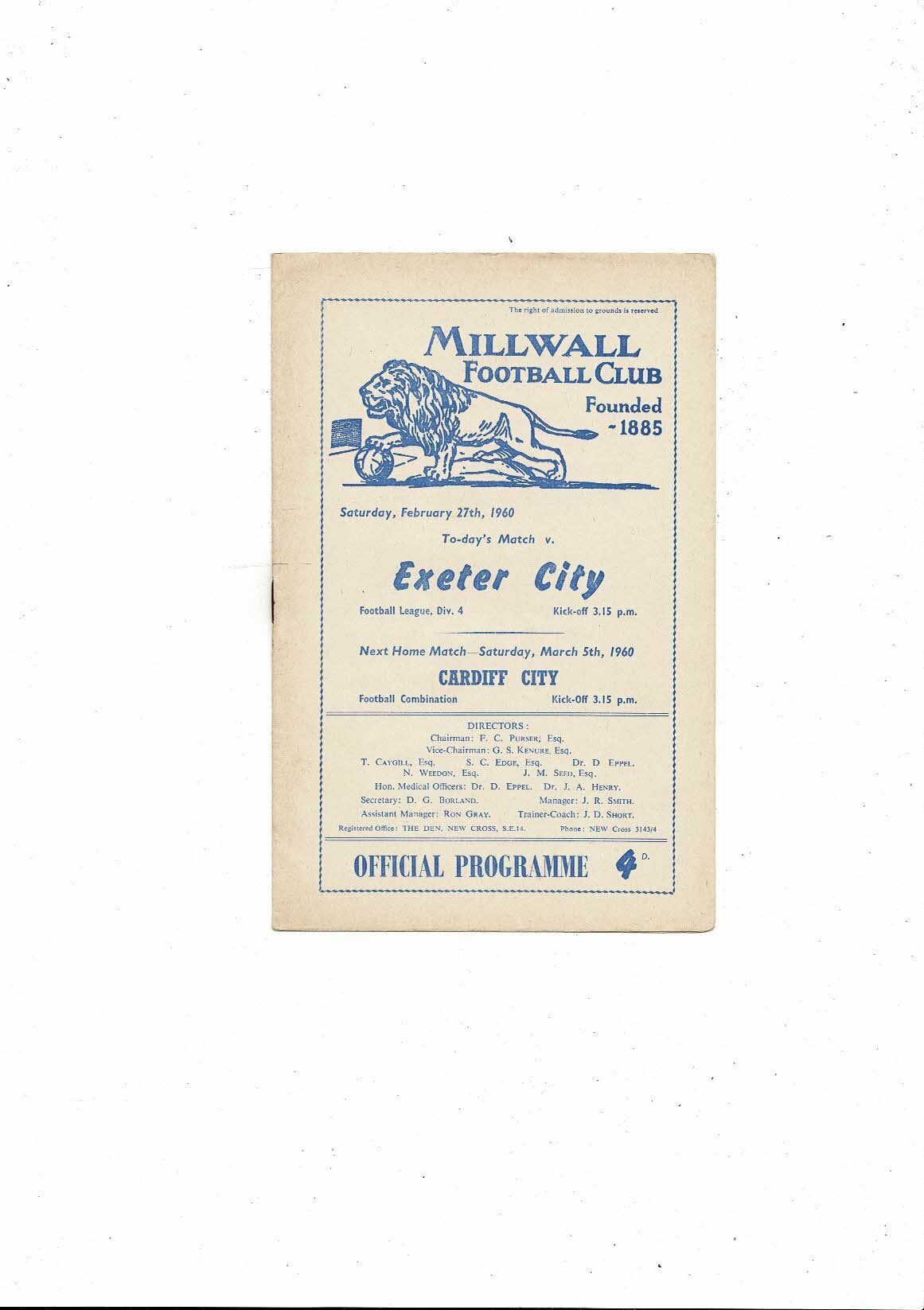 1959/60 Millwall v Exeter City Football Programme