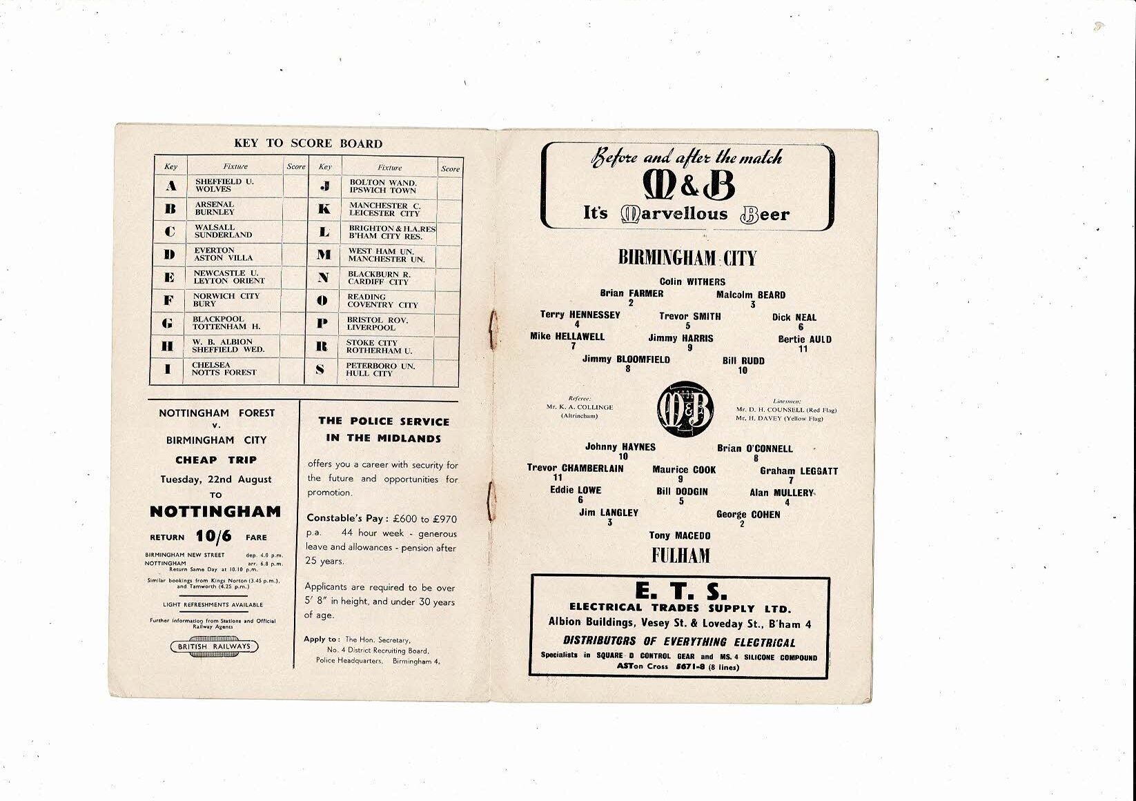 1961/62 Birmingham City v Fulham Football Programme