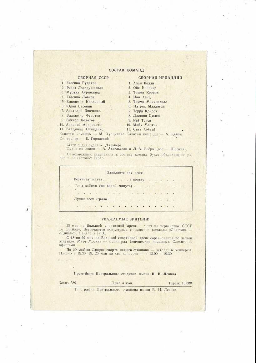 1973 Russia v Republic of Ireland Football Programme