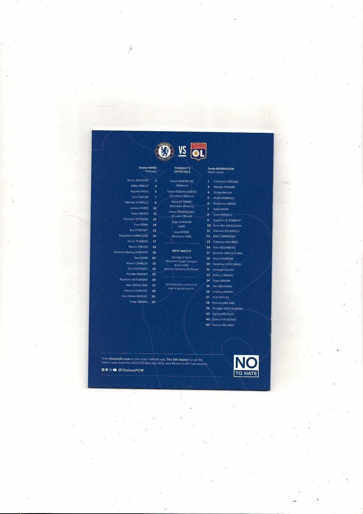2022/23 Chelsea v Lyon Womens Champions League Football Progamme