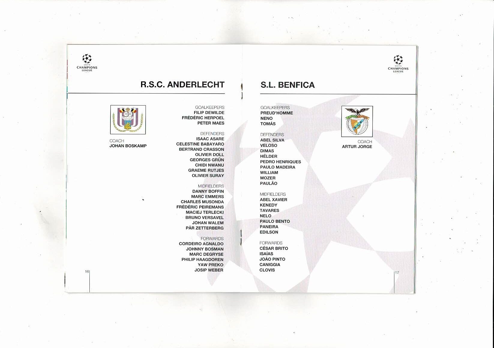 Anderlecht v Benfica UEFA Champions League Football Programme 1994/95