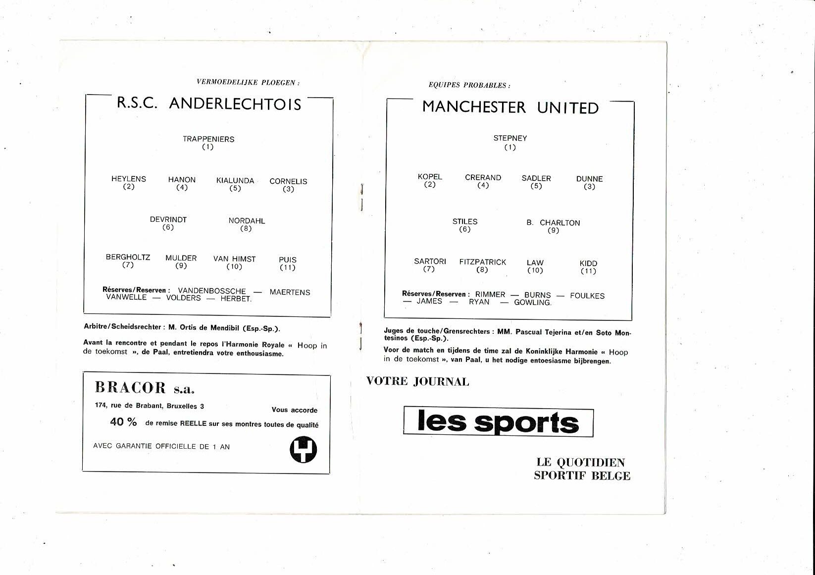 Anderlecht v Manchester United European Cup Football Programme 1968/69