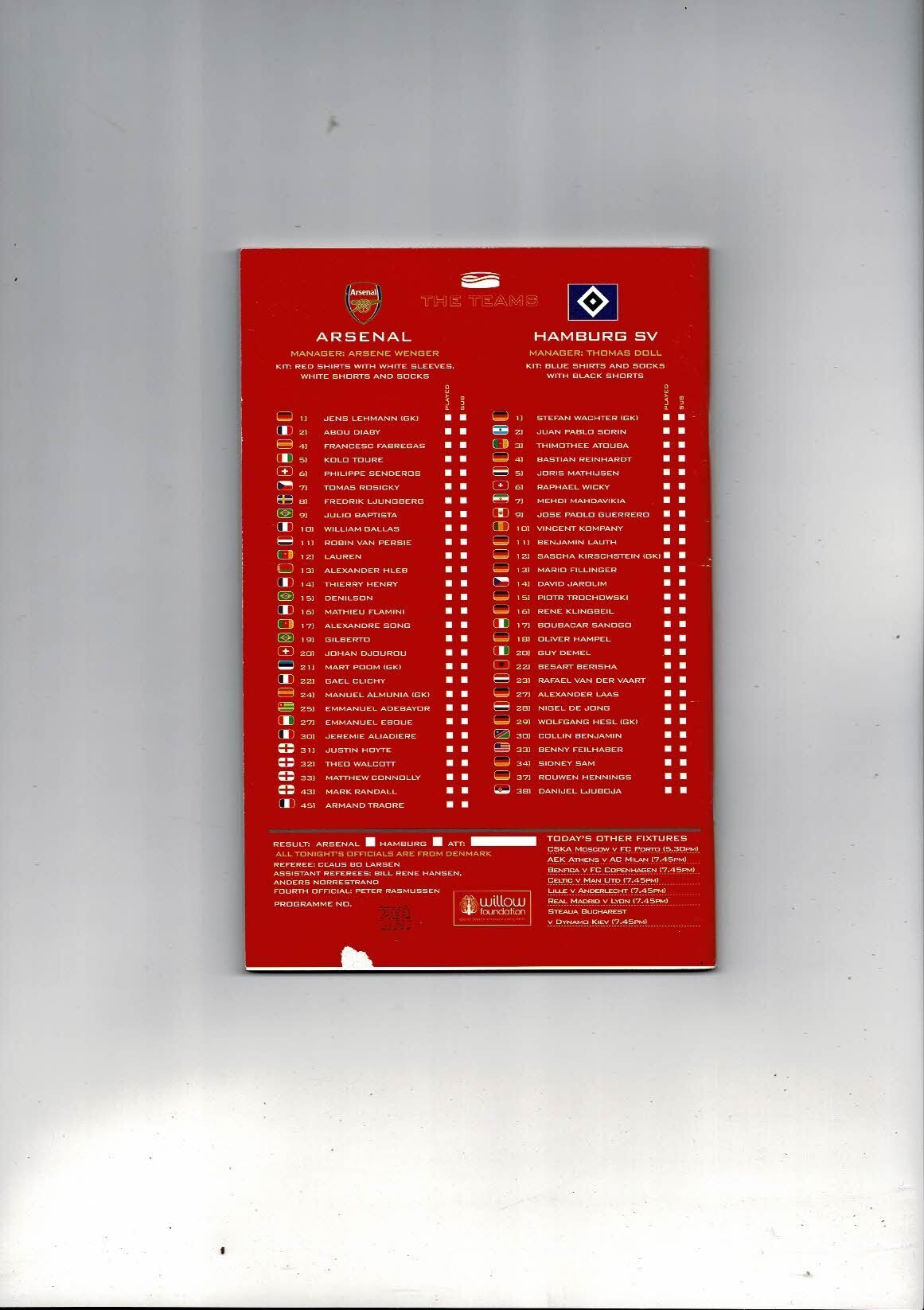 Arsenal v Hamburg Champions League Football Programme 2006/07
