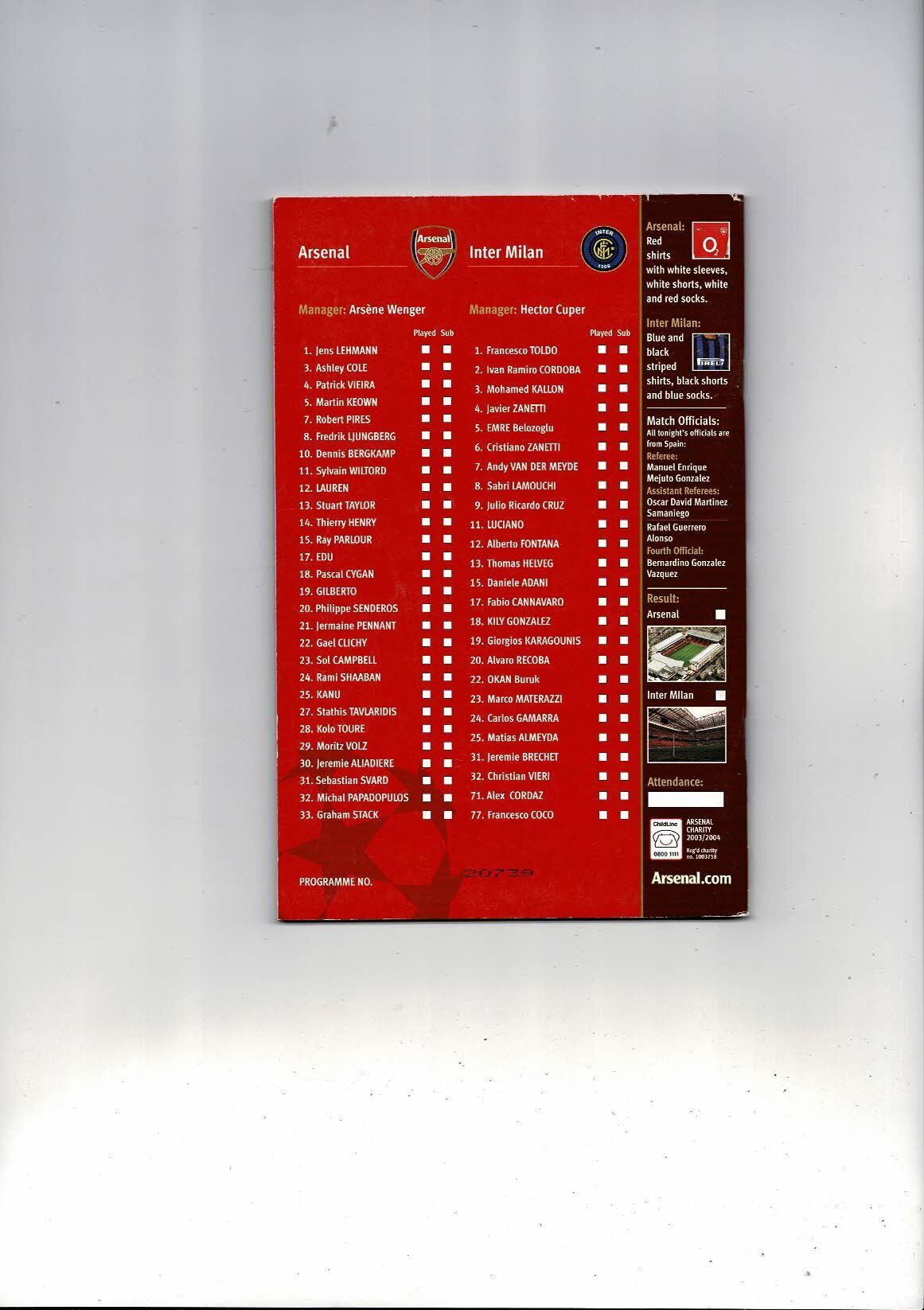 Arsenal v Inter Milan Champions League Football Programme 2003/04