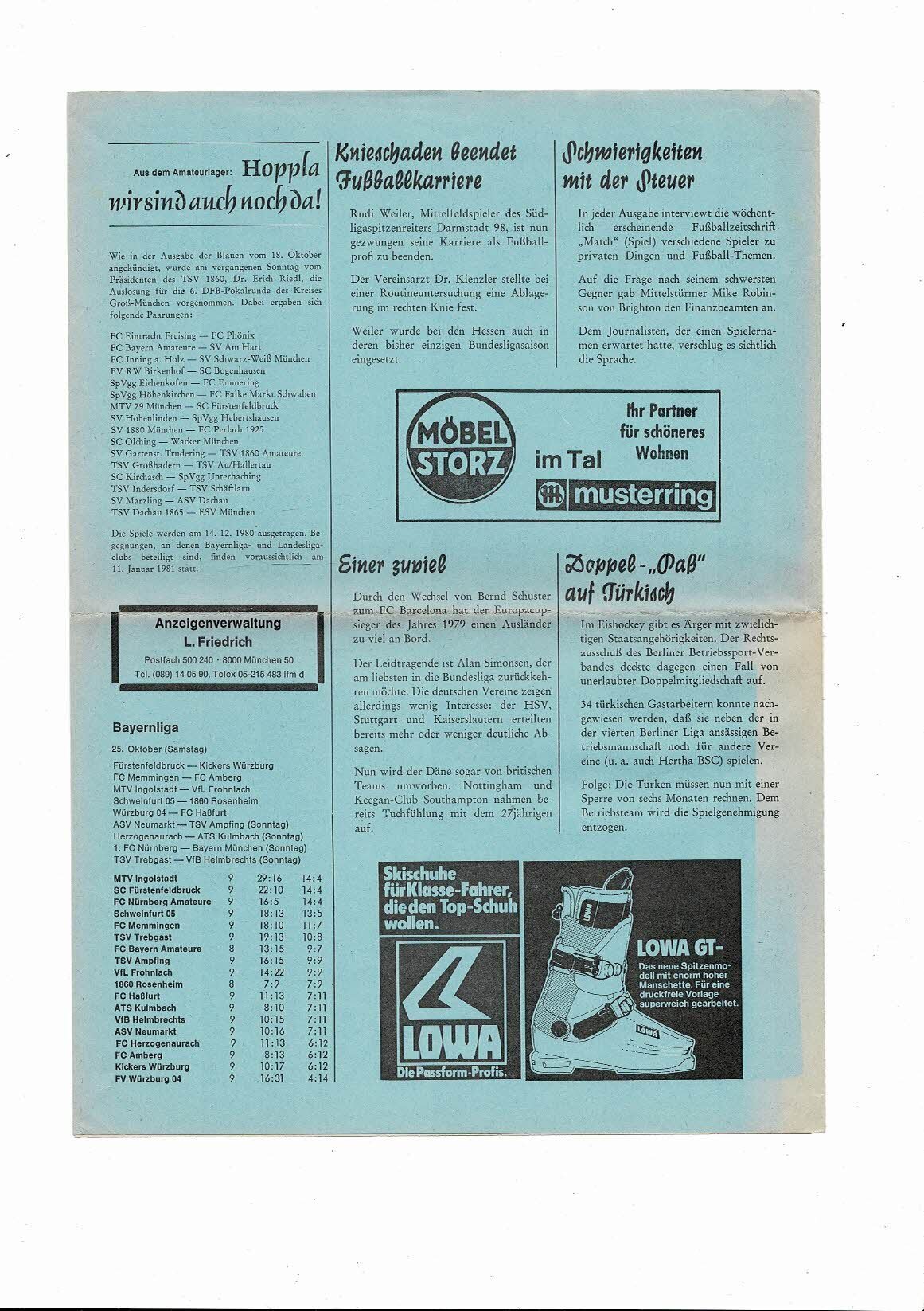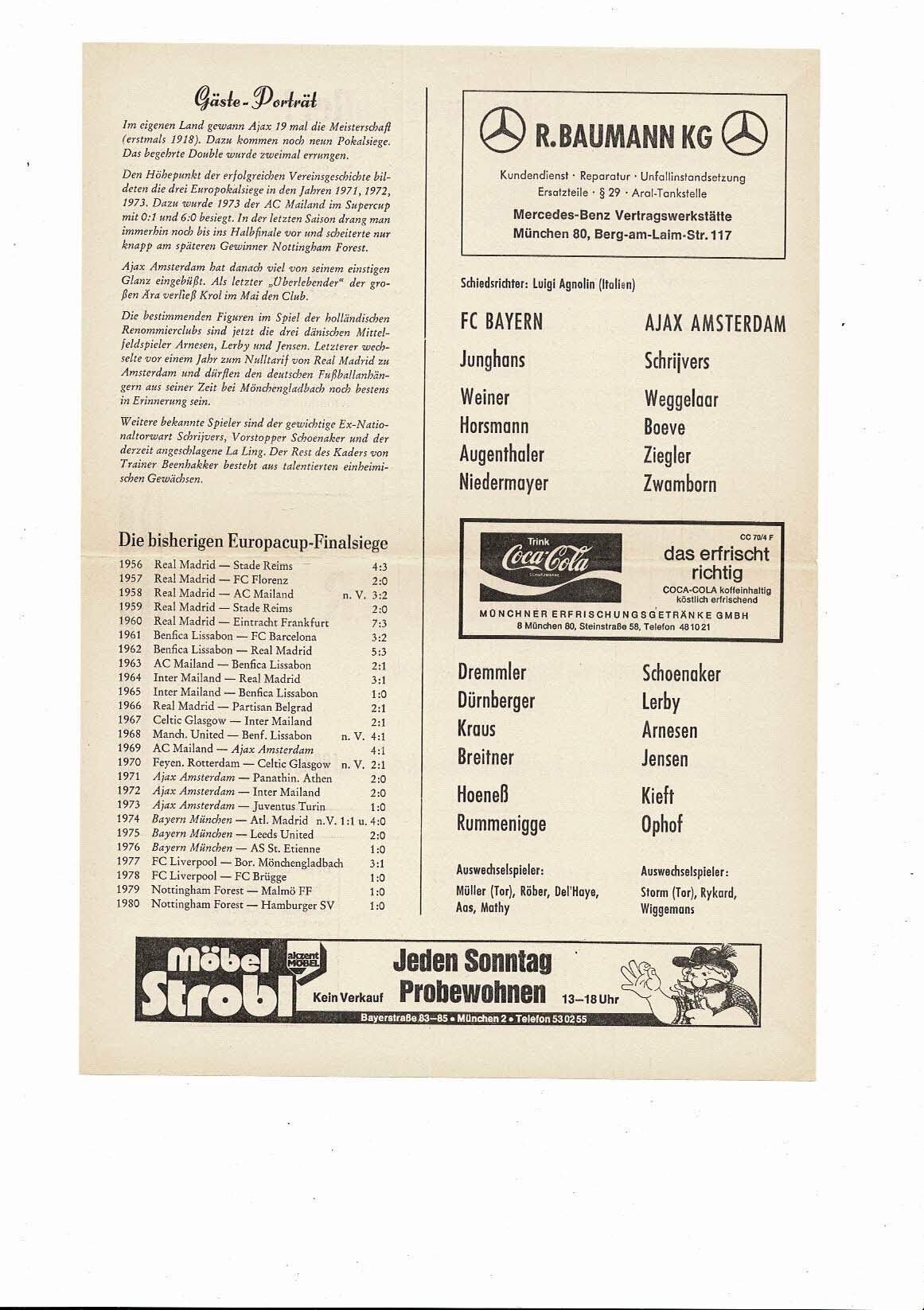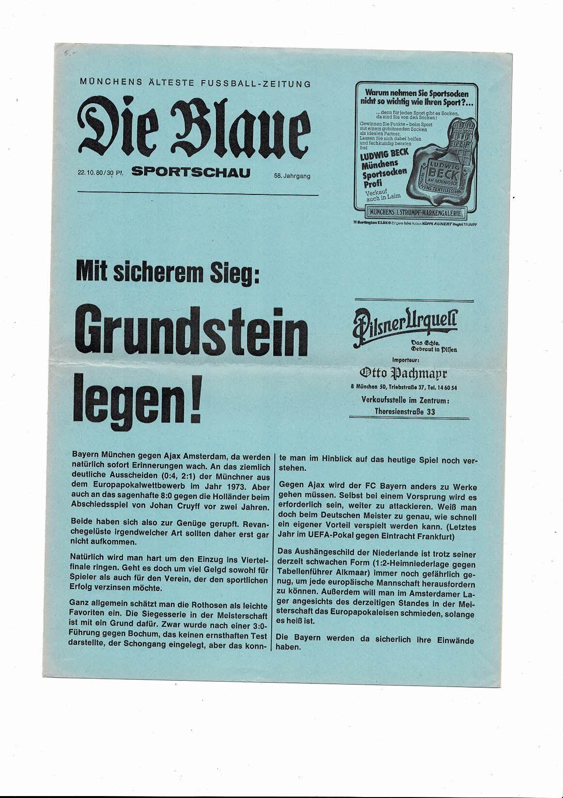 Bayern Munich v Ajax European Cup Football Programme Die Blaue 1980/81