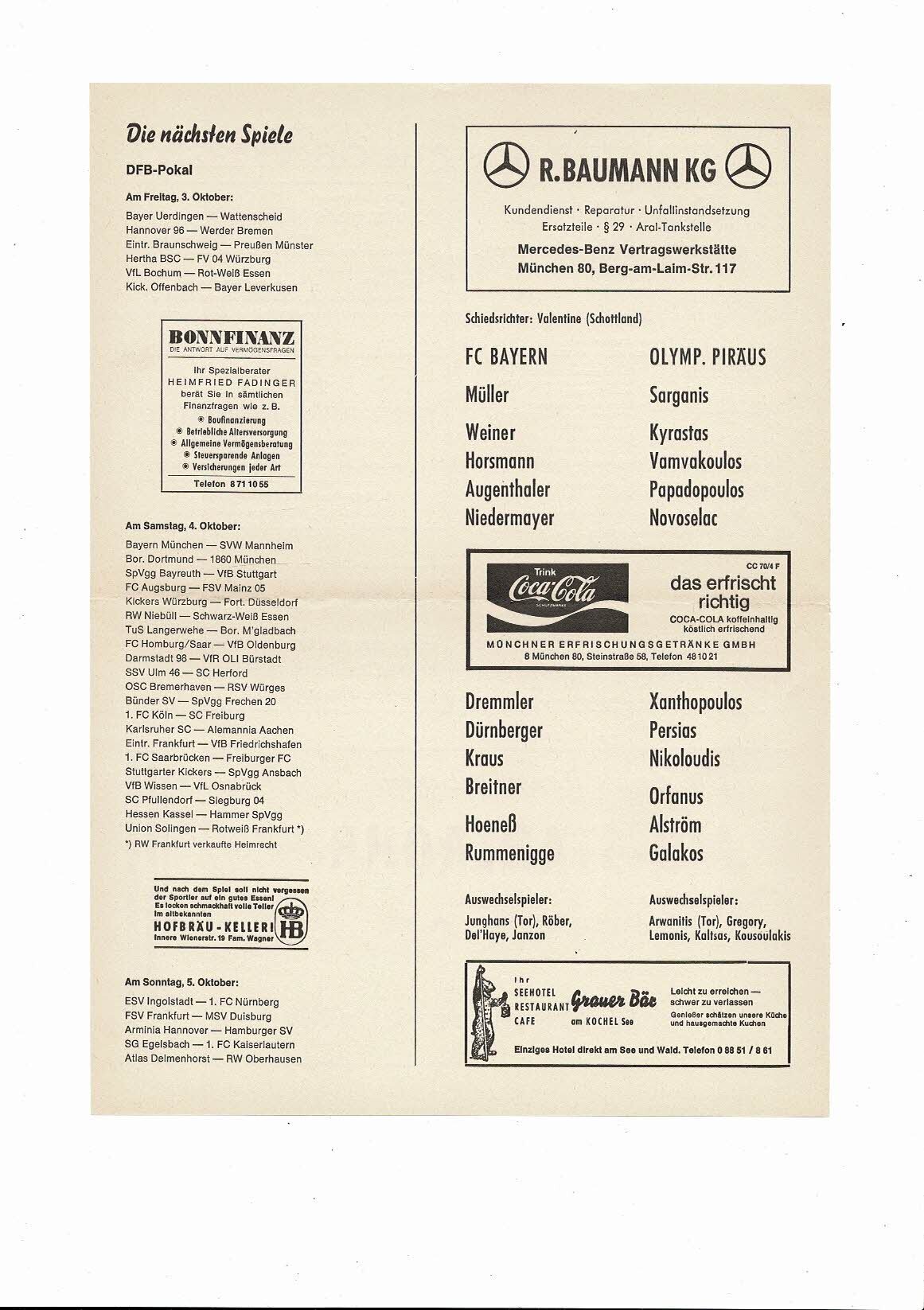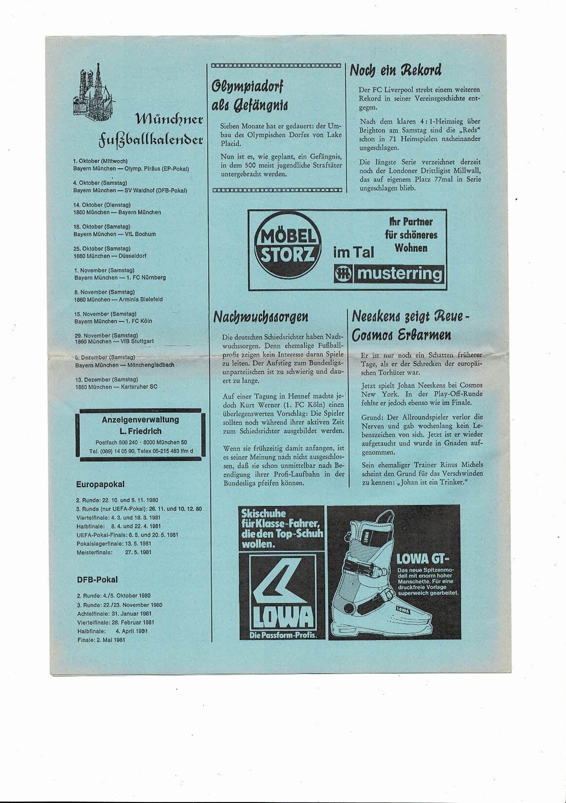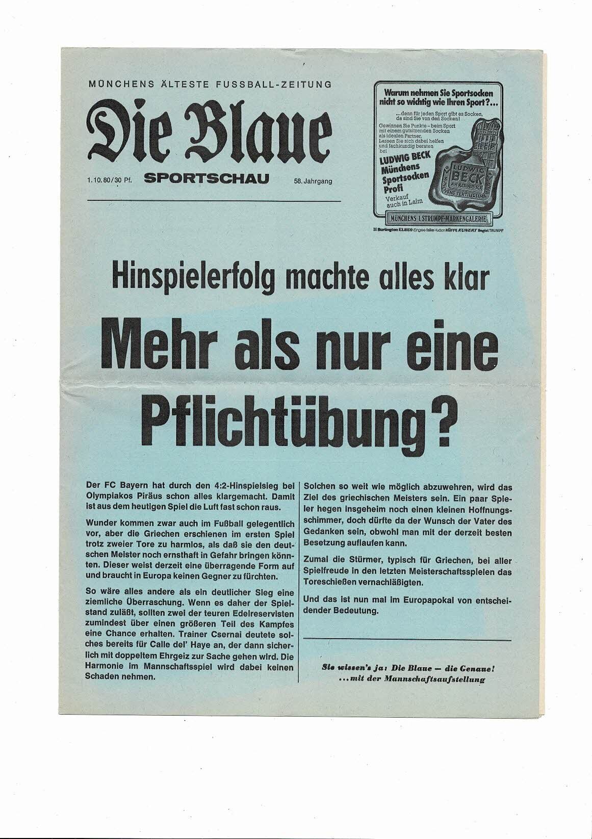Bayern Munich v Olympiakos European Cup Football Programme Die Blaue edition 1980/81