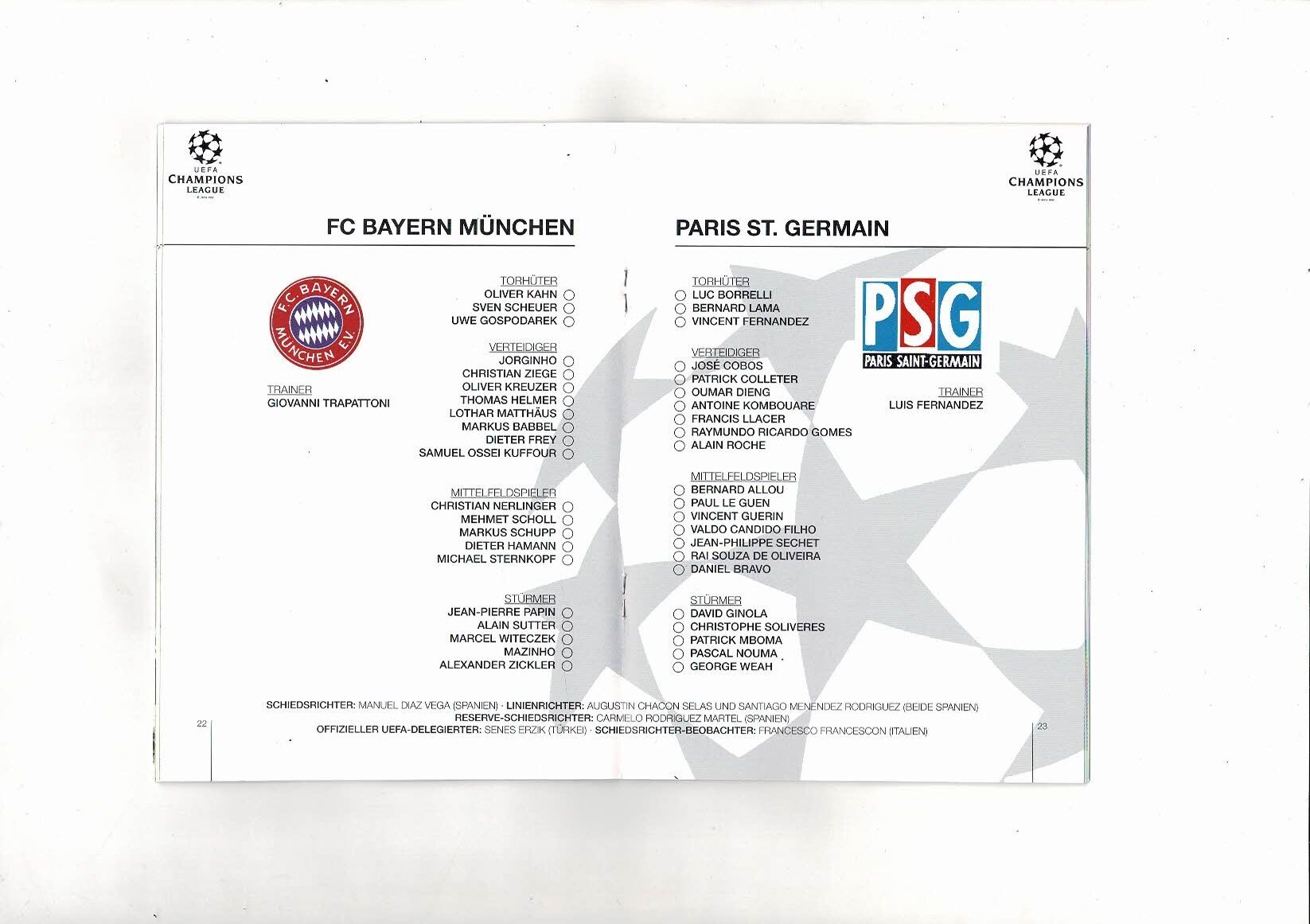 Bayern Munich v Paris St Germain UEFA Champions League Football Programme 1994/95