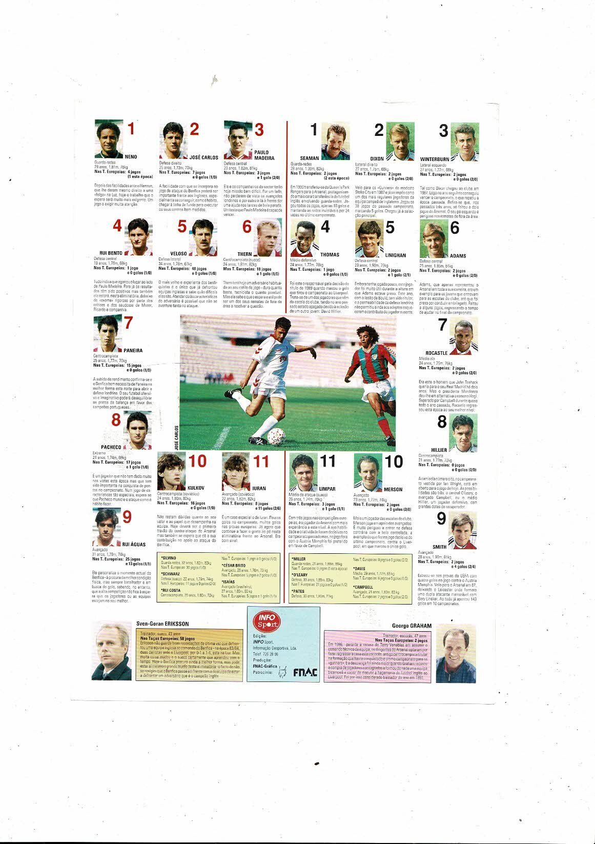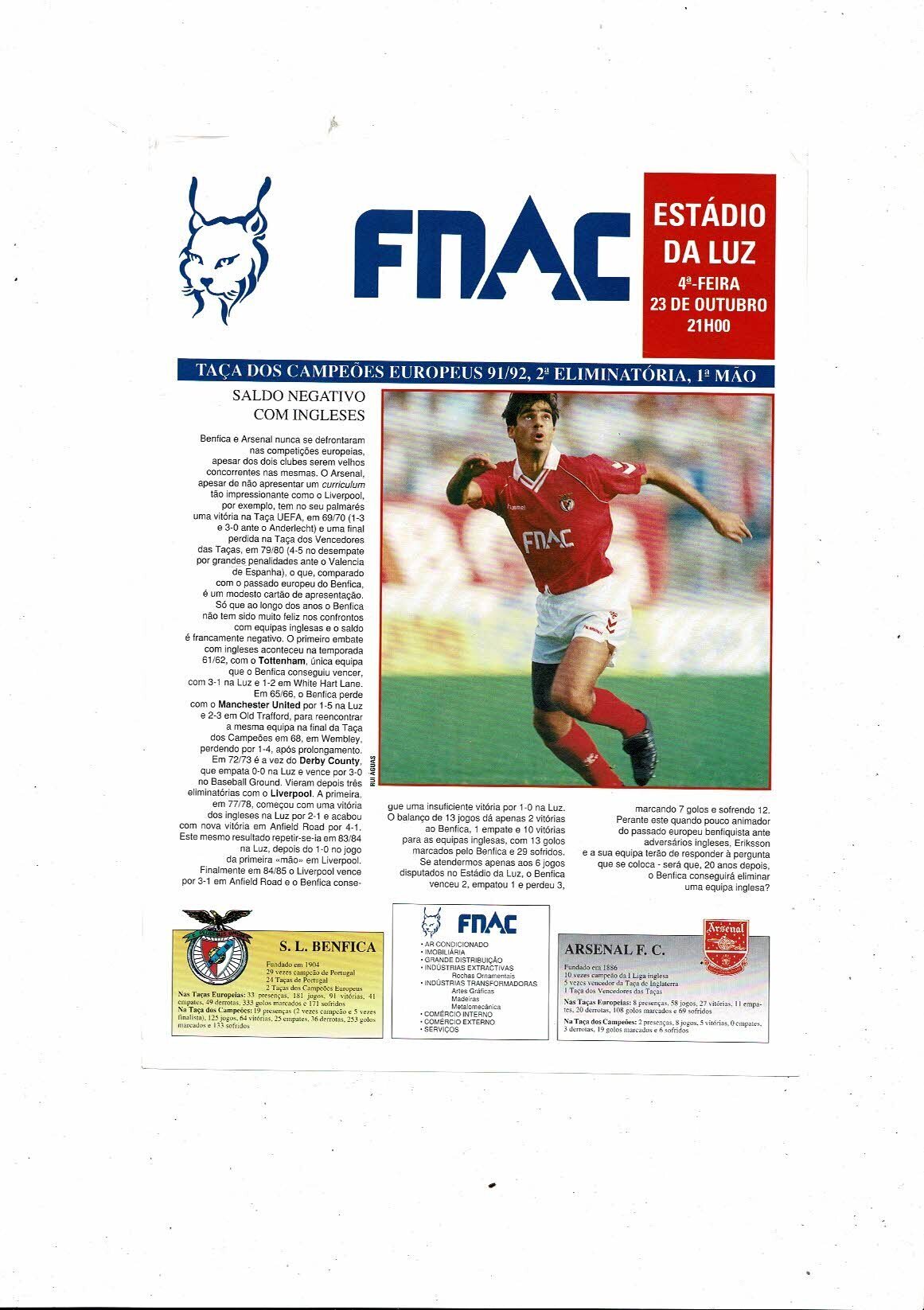 Benfica v Arsenal European Cup Football Programme 1991/1992