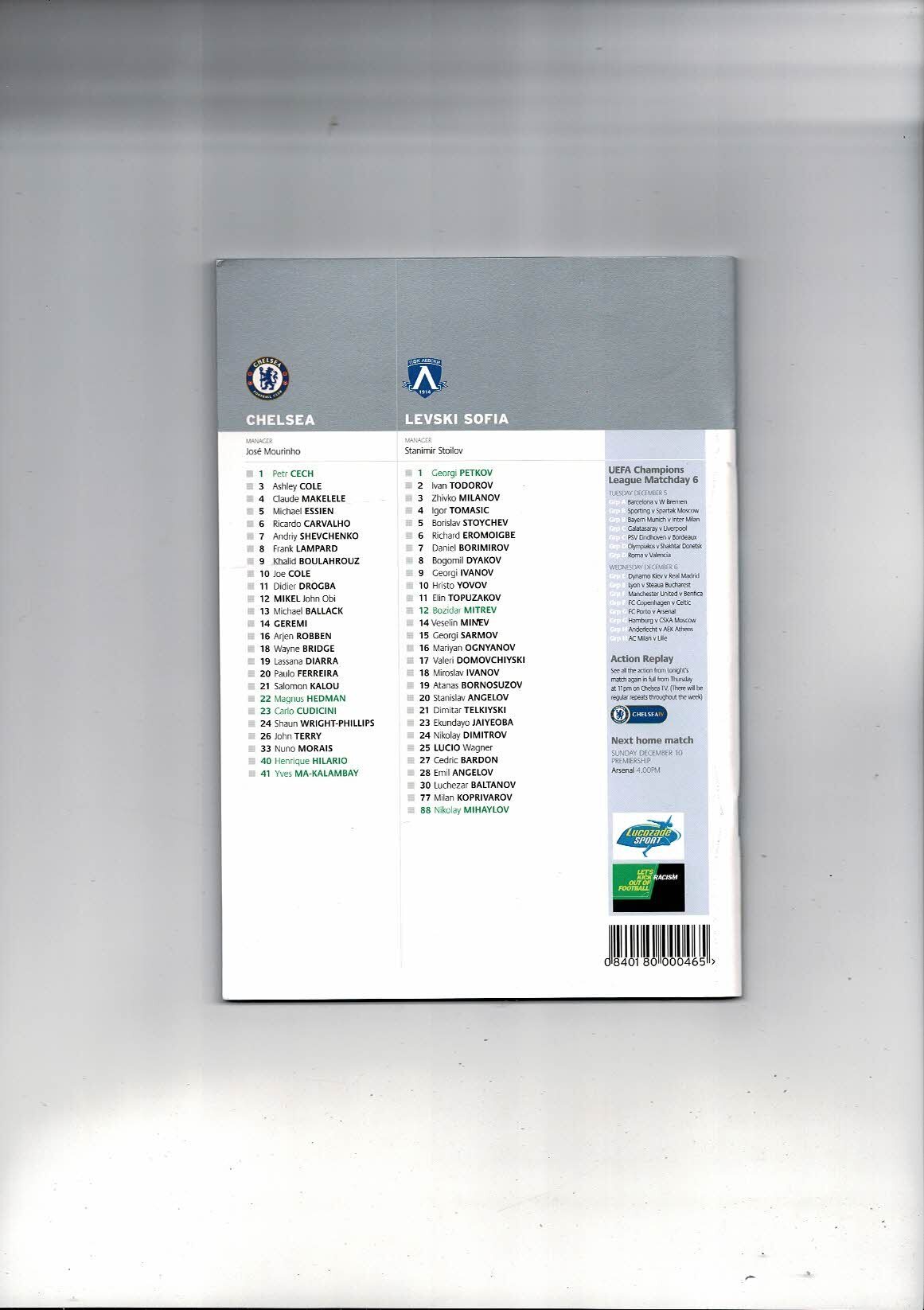 Chelsea v Levski Sofia Champions League Football Programme + Ticket 2006/07