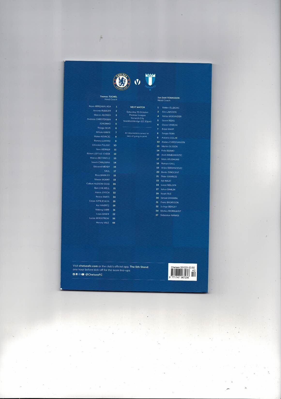 Chelsea v Malmo Champions League Football Programme 2021/22