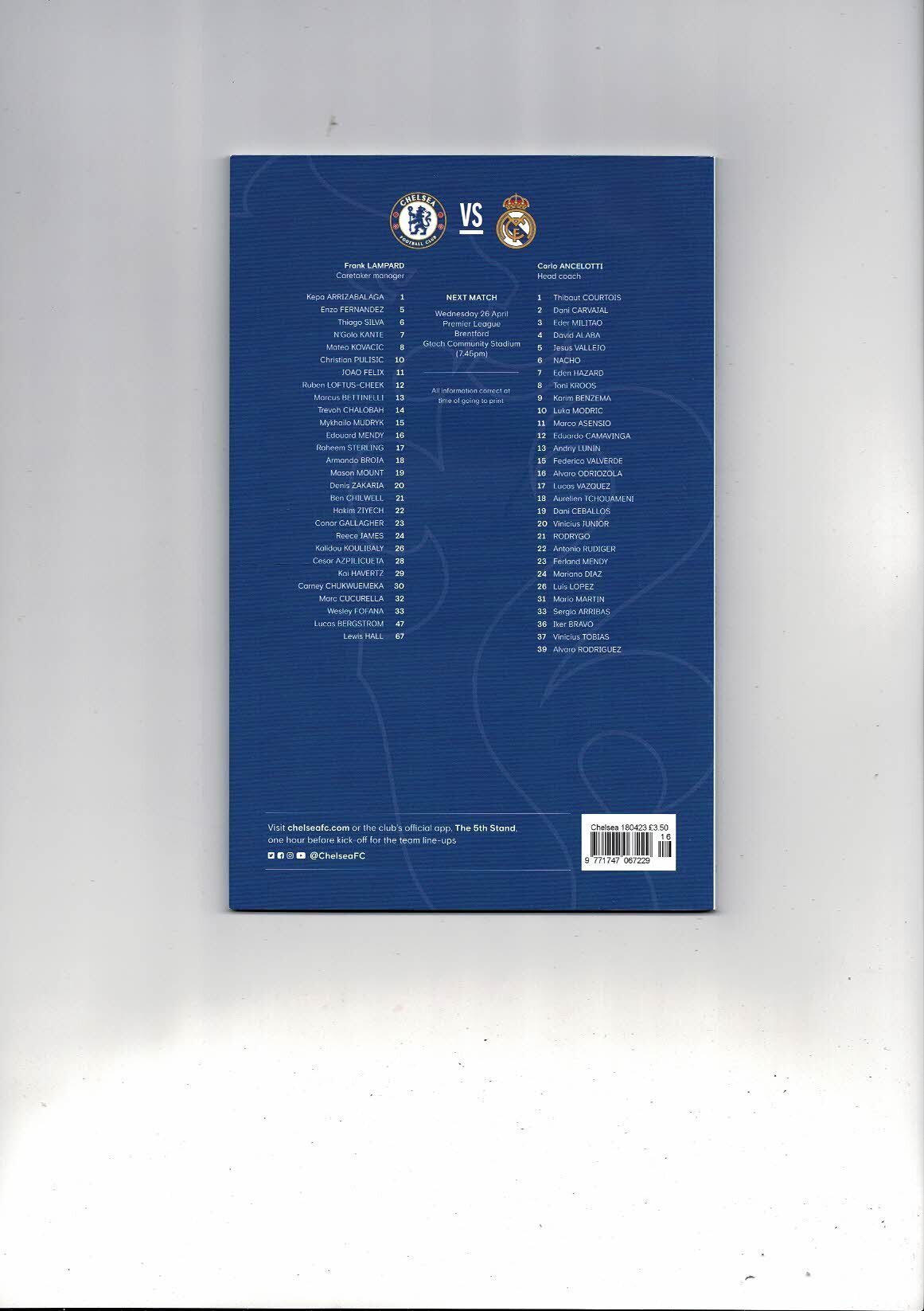 Chelsea v Real Madrid Champions League Football Programme 2022/23