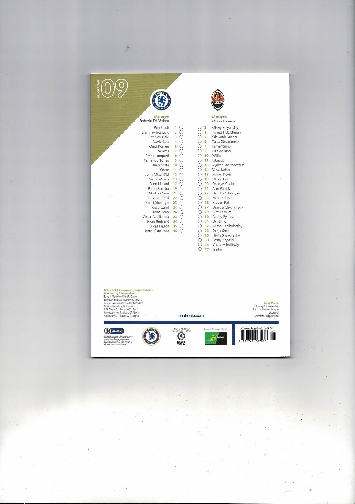 Chelsea v Shakhtar Donetsk Champions League Football Programme 2012/13