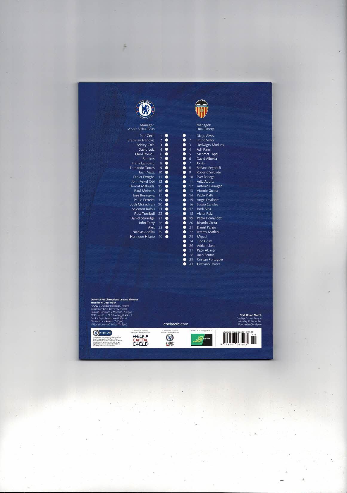 Chelsea v Valencia Champions League Football Programme 2011/12