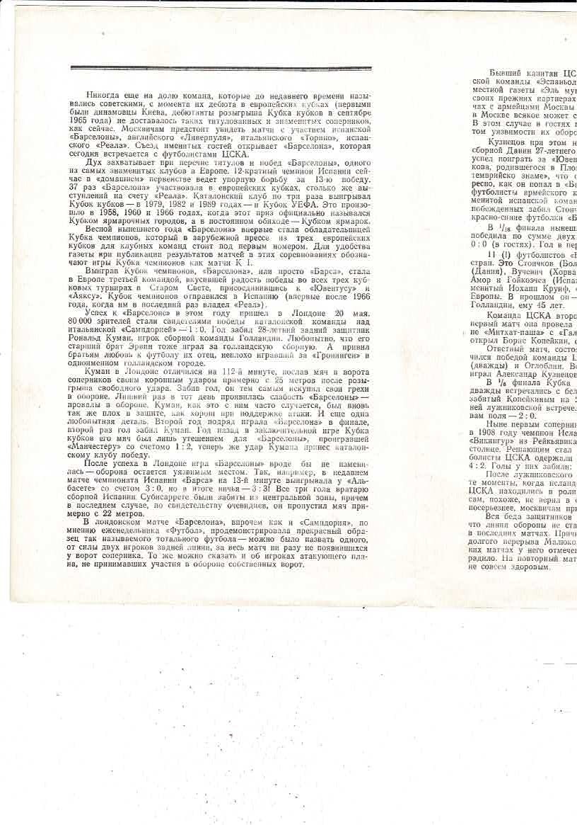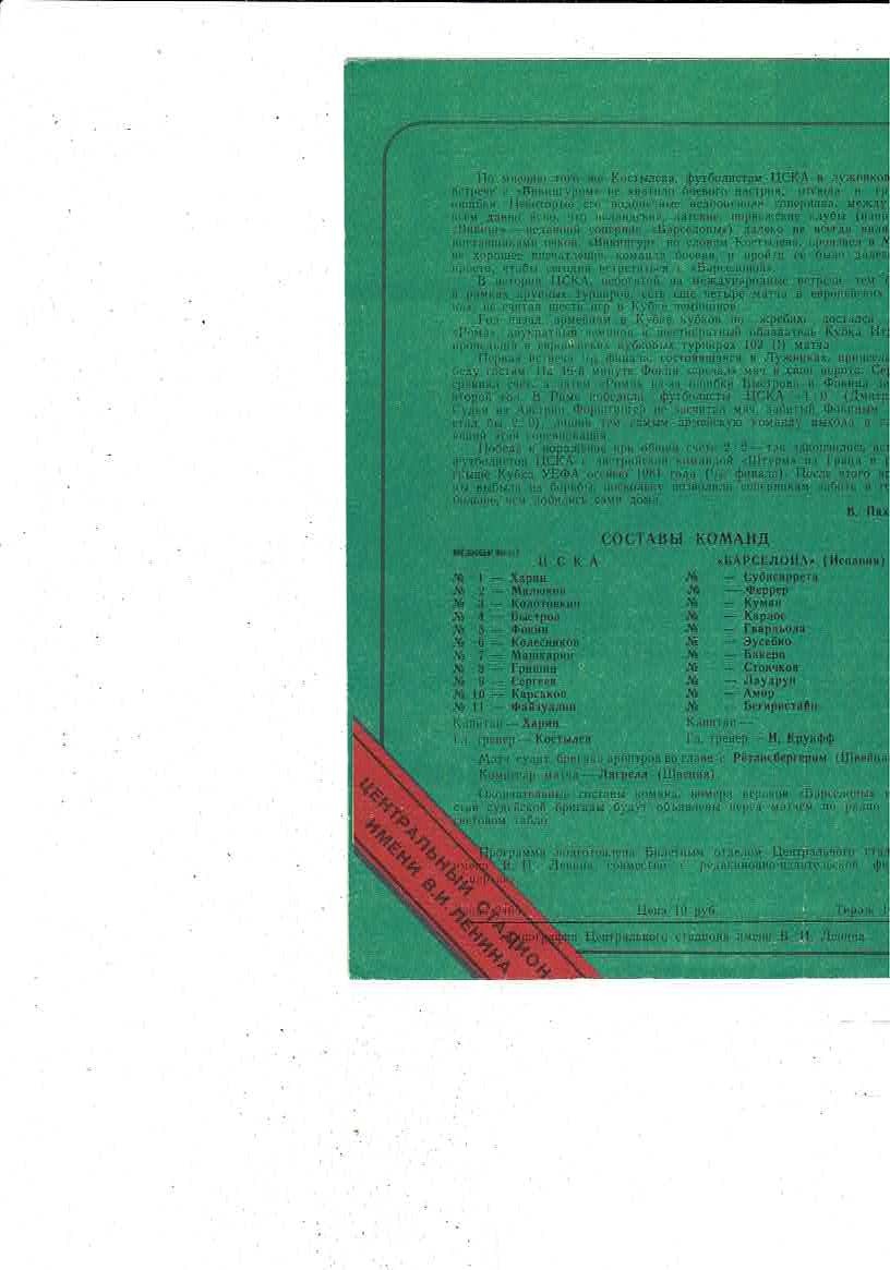 CSKA Moscow v FC Barcelona European Cup Football Programme 1982/83