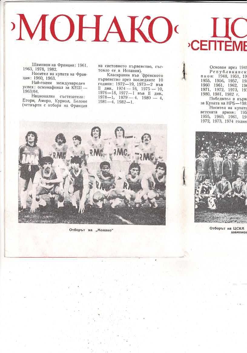 CSKA Sofia v AS Monaco European Cup Football Programme 1982/83