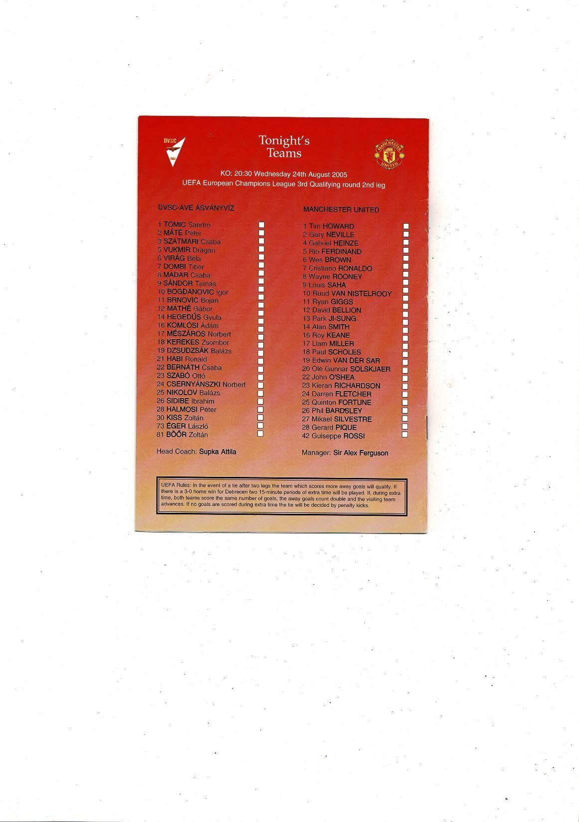 Debrecen VSC-AVE Asvanyviz v Manchester United Champions League Football Programme 2005/06