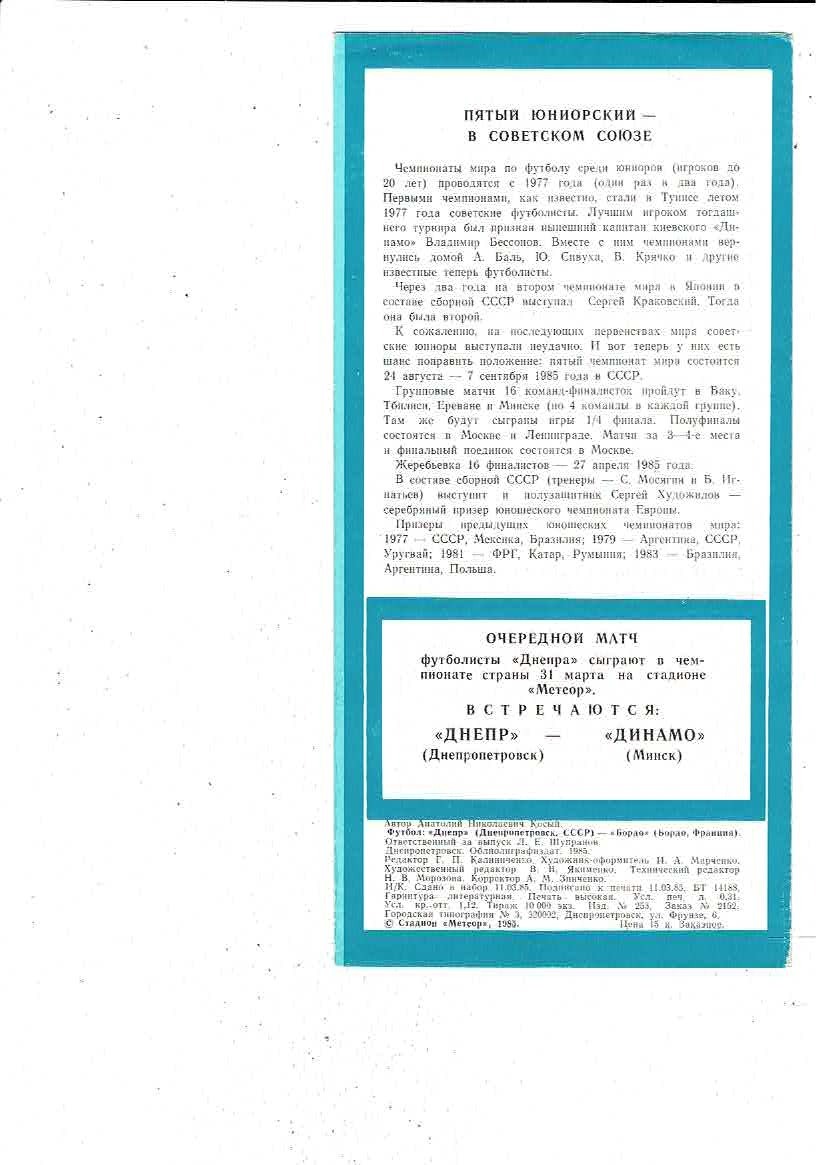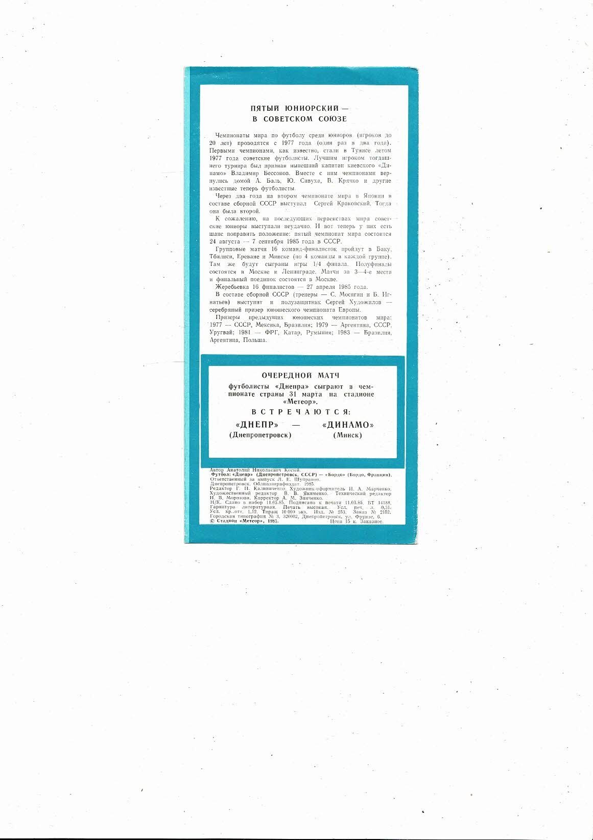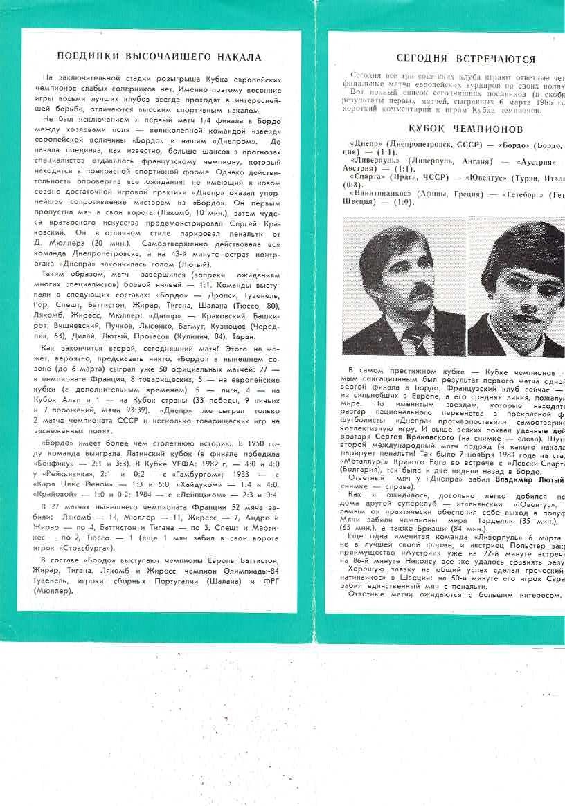 Dnepropetrovsk v Girondins de Bordeaux European Cup Football Programme 1984/85