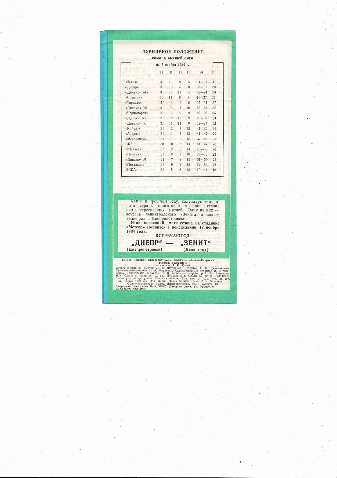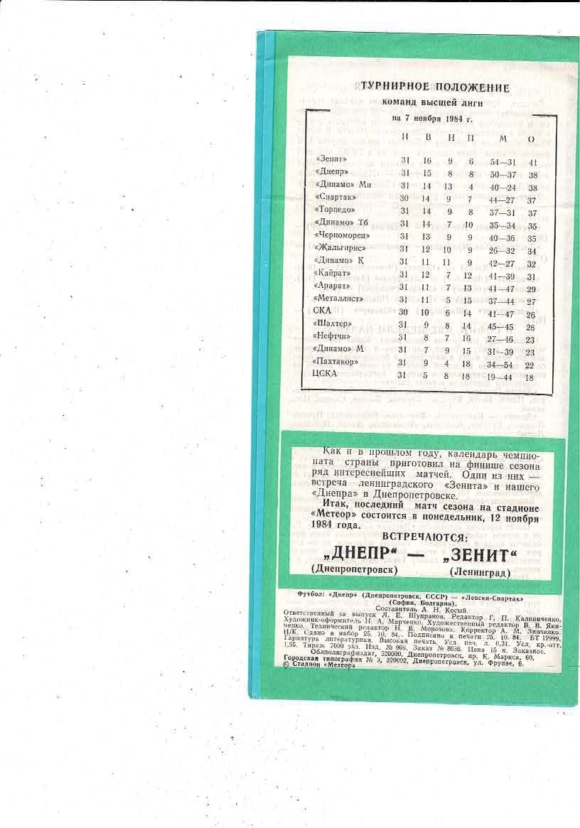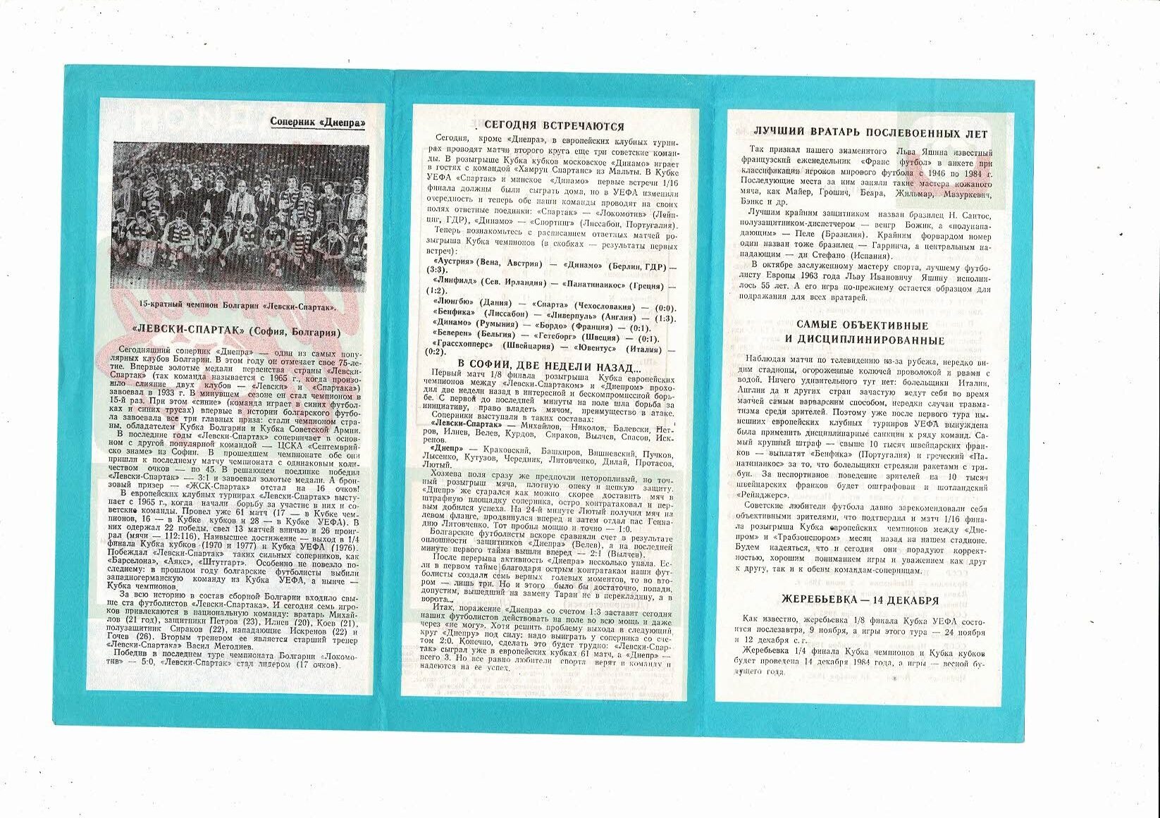 Dnepropetrovsk v Levski Spartak European Cup Football Programme 1984/85