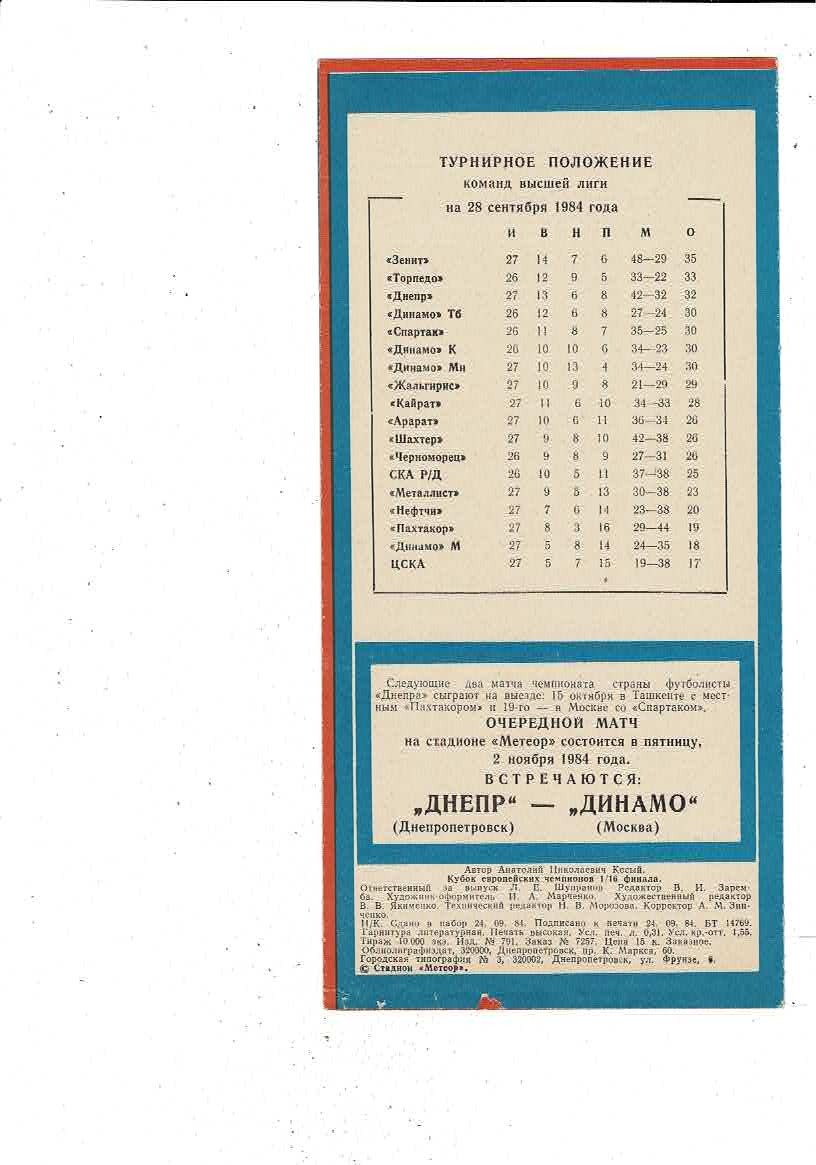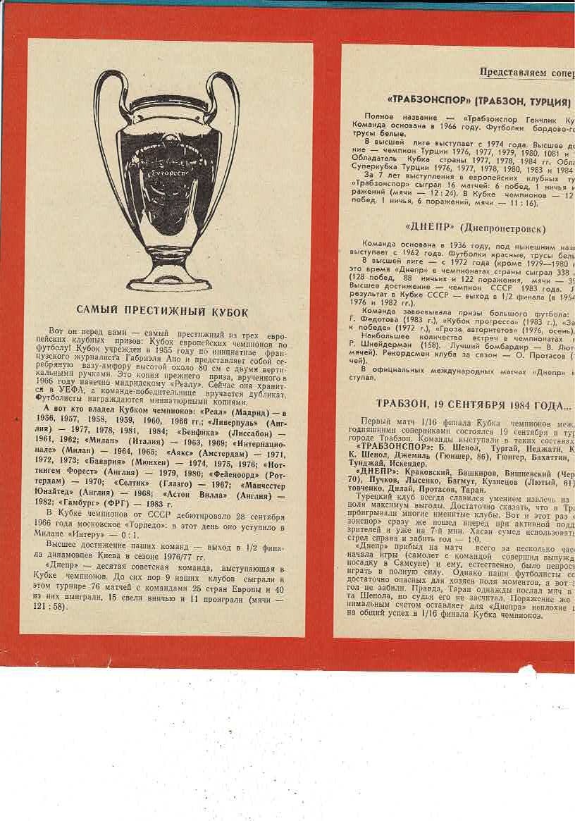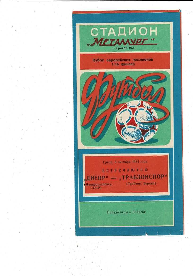 Dnepropetrovsk v Trabsonspor European Cup Football Programme 1984/85