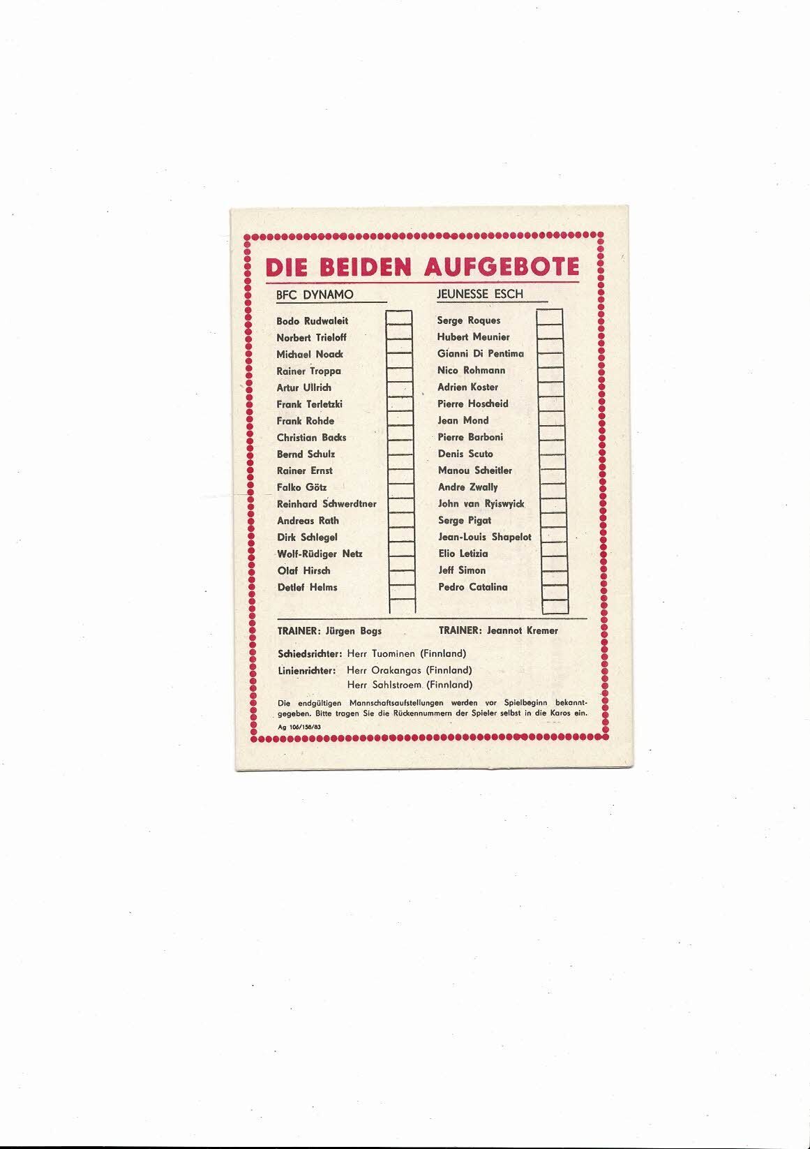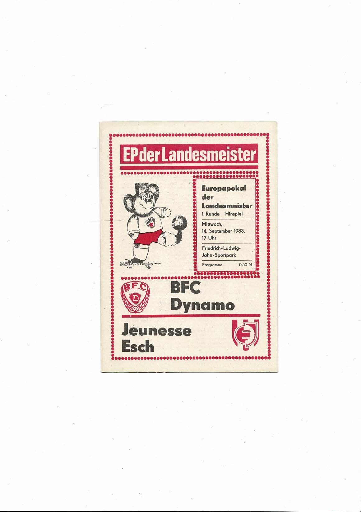 Dynamo Berlin v Jeuness Esch European Cup Football Programme 1983/84