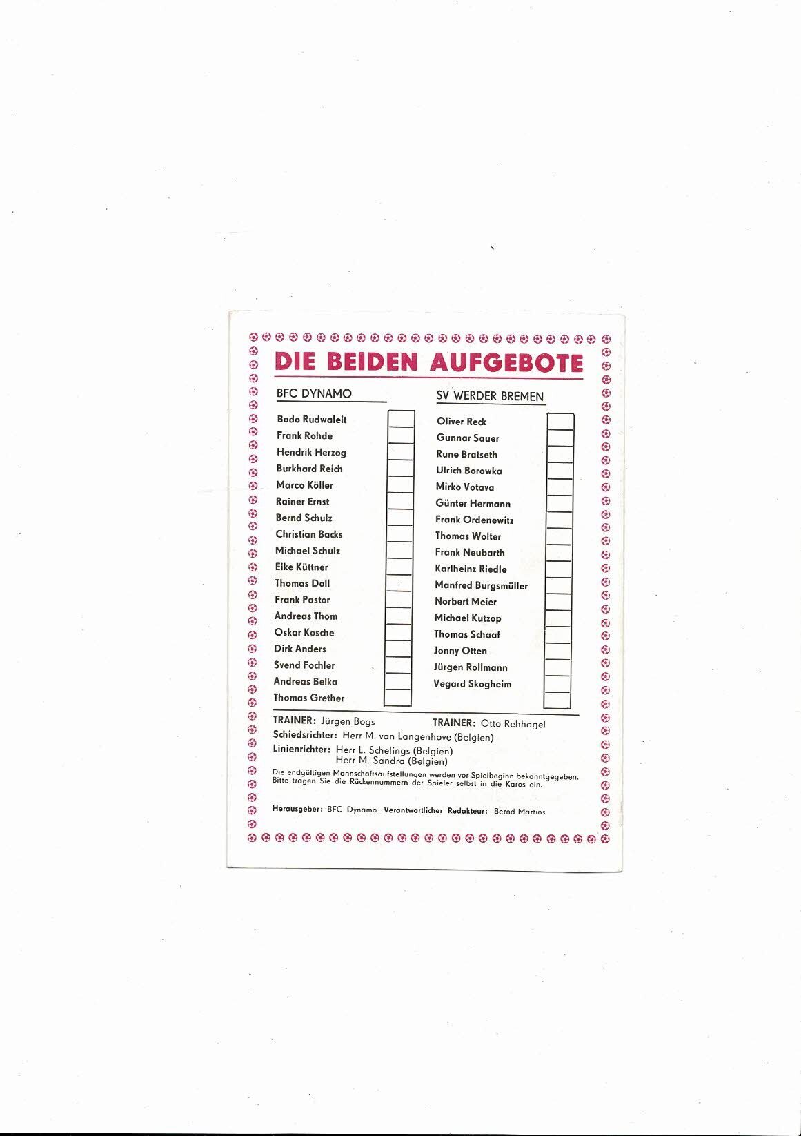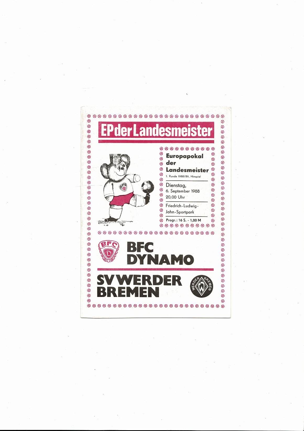Dynamo Berlin v Werder Bremen European Cup Football Programme 1988/89