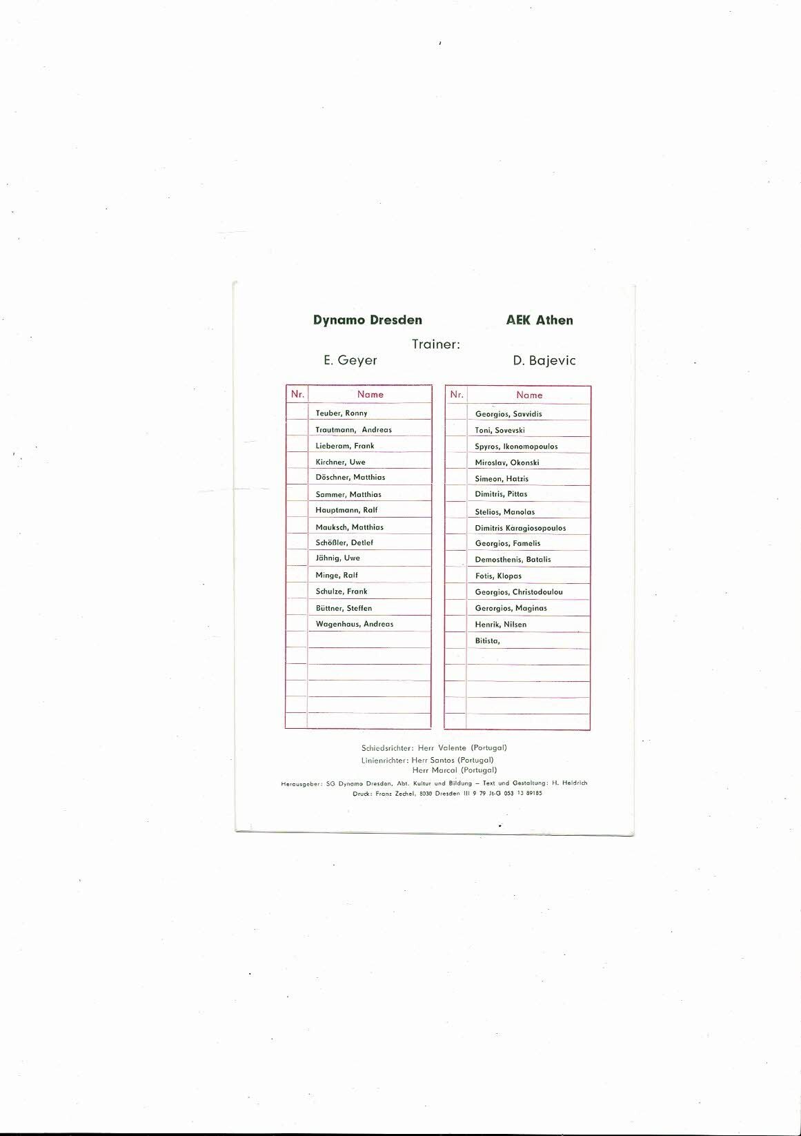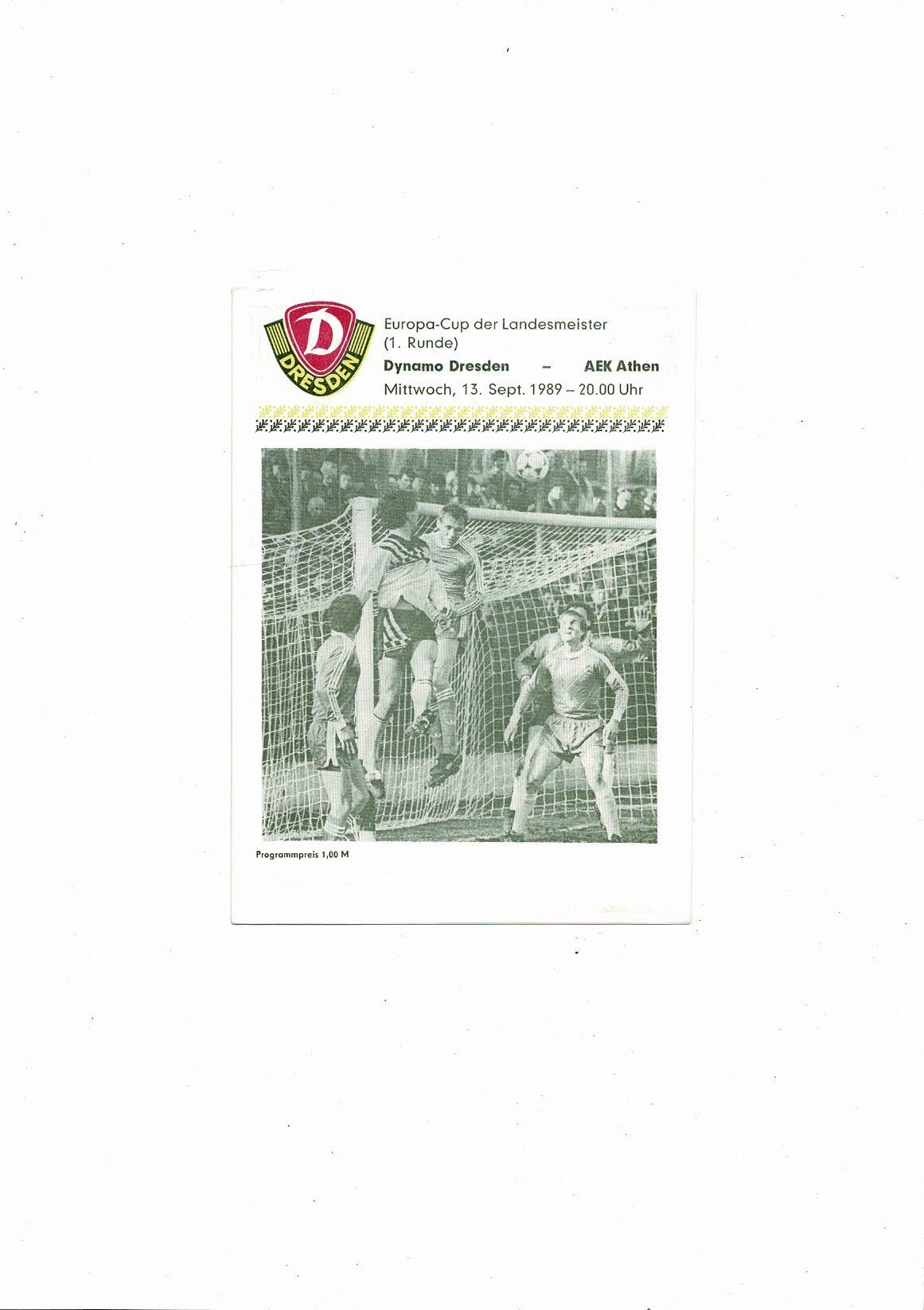 Dynamo Dresden v AEK Athens European Cup Football Programme 1989/90
