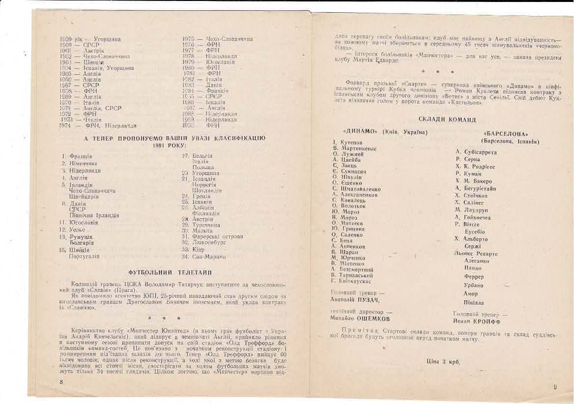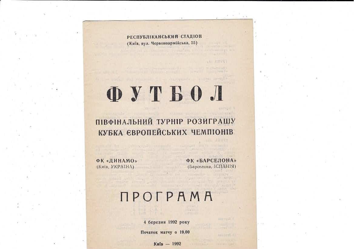 Dynamo Kiev v FC Barcelona European Cup Football Programme 1991/92