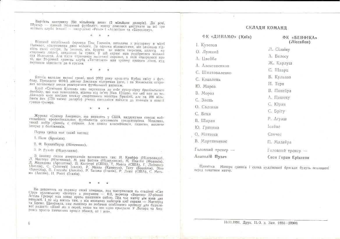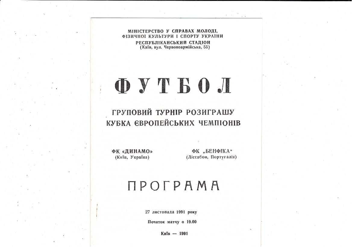 Dynamo Kiev v FC Benfica European Cup Football Programme 1991/92