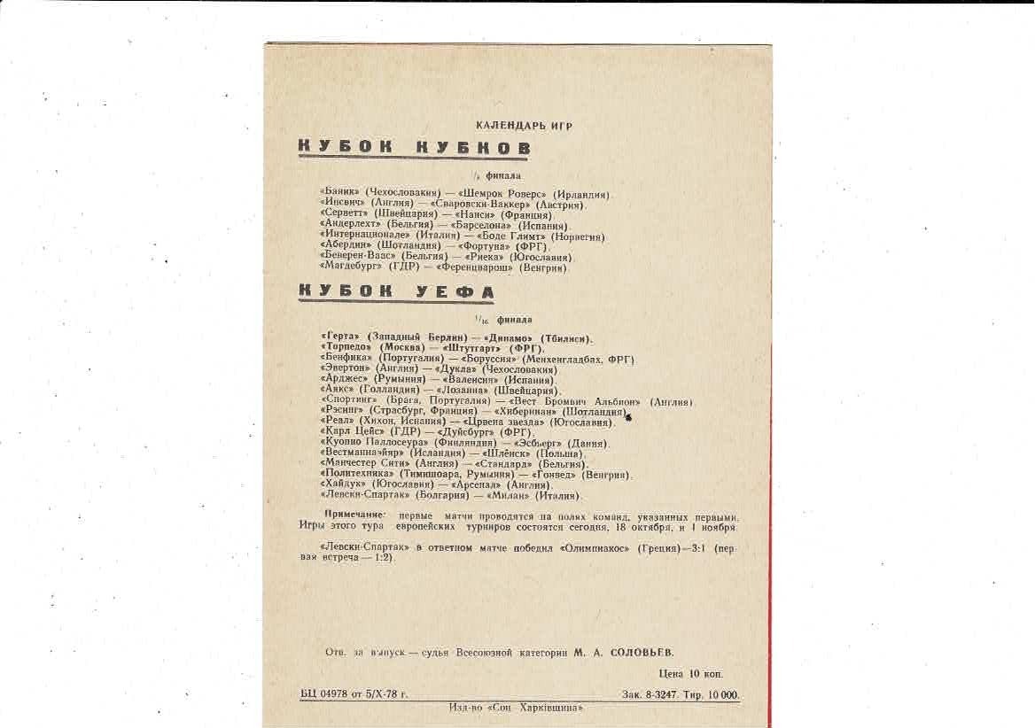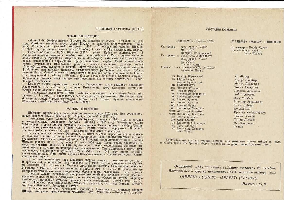Dynamo Kiev v Malmo FF European Cup Football Programme 1978/79