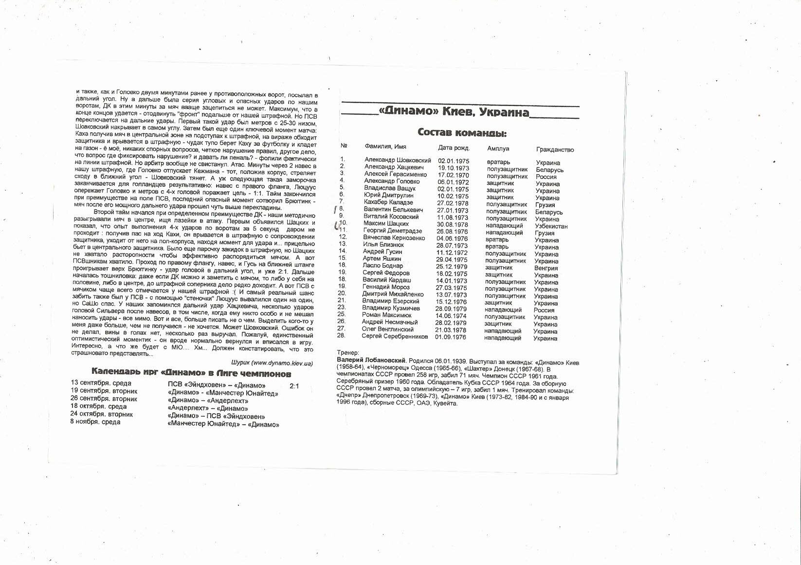 Dynamo Kiev v Manchester United Unofficial Champions League Football Programme 2000/01