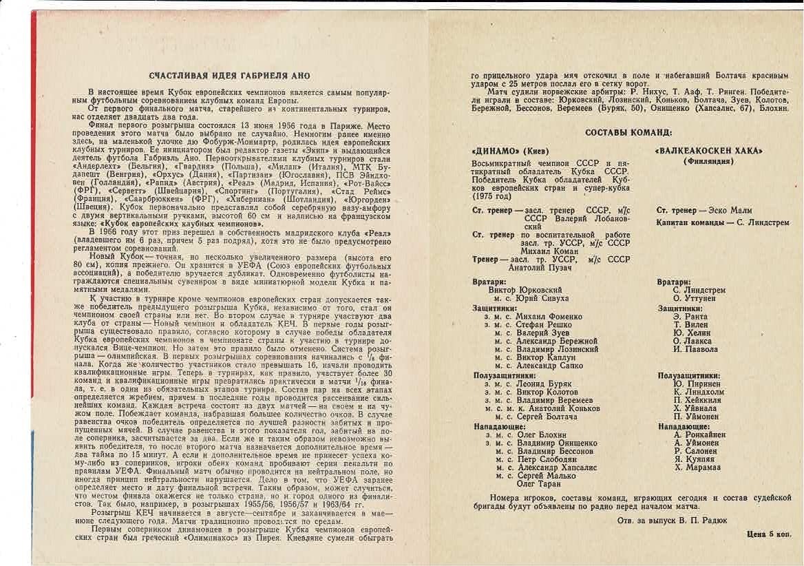 Dynamo Kiev v Valkeakosken Haka European Cup Football Programme 1978/79