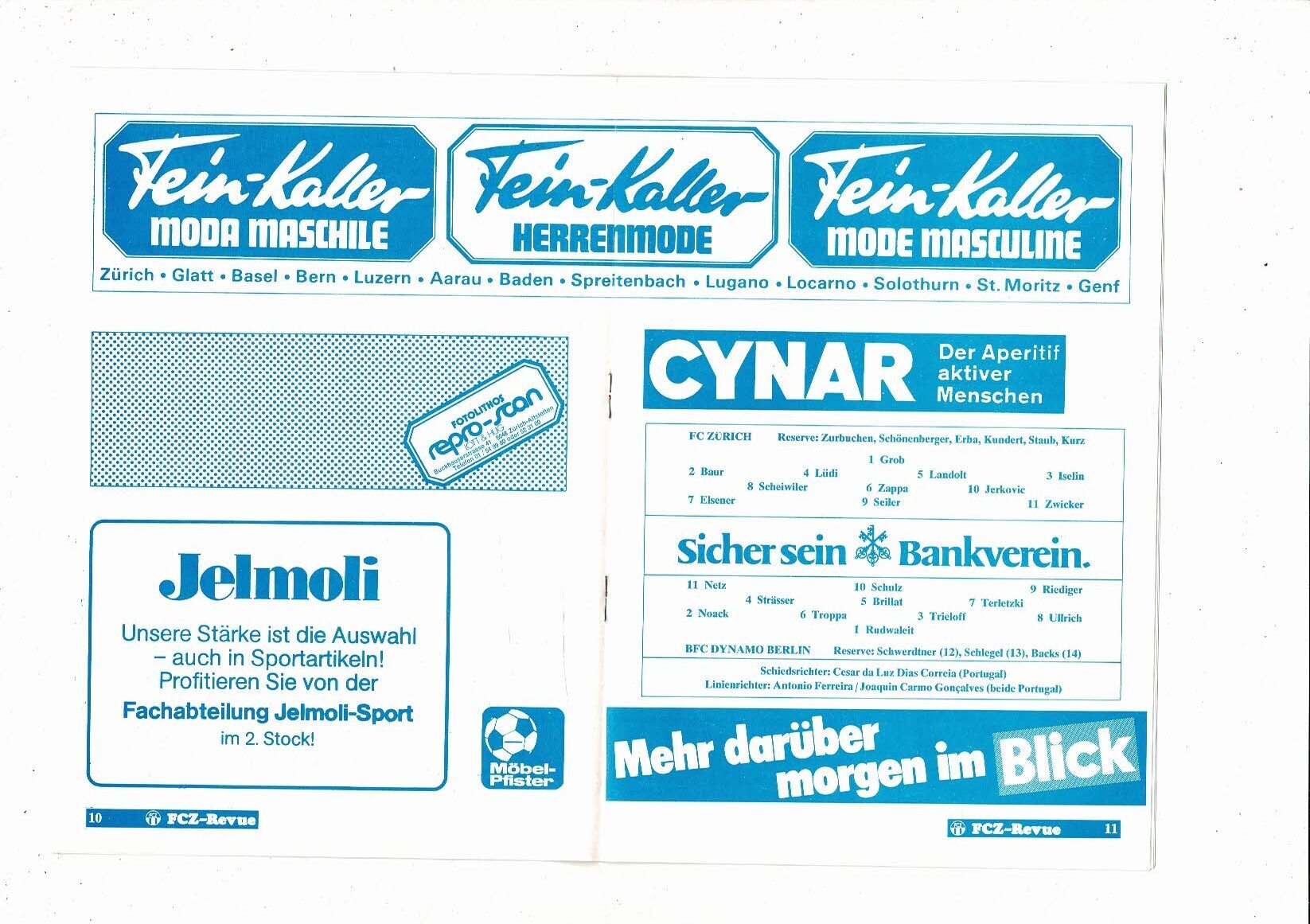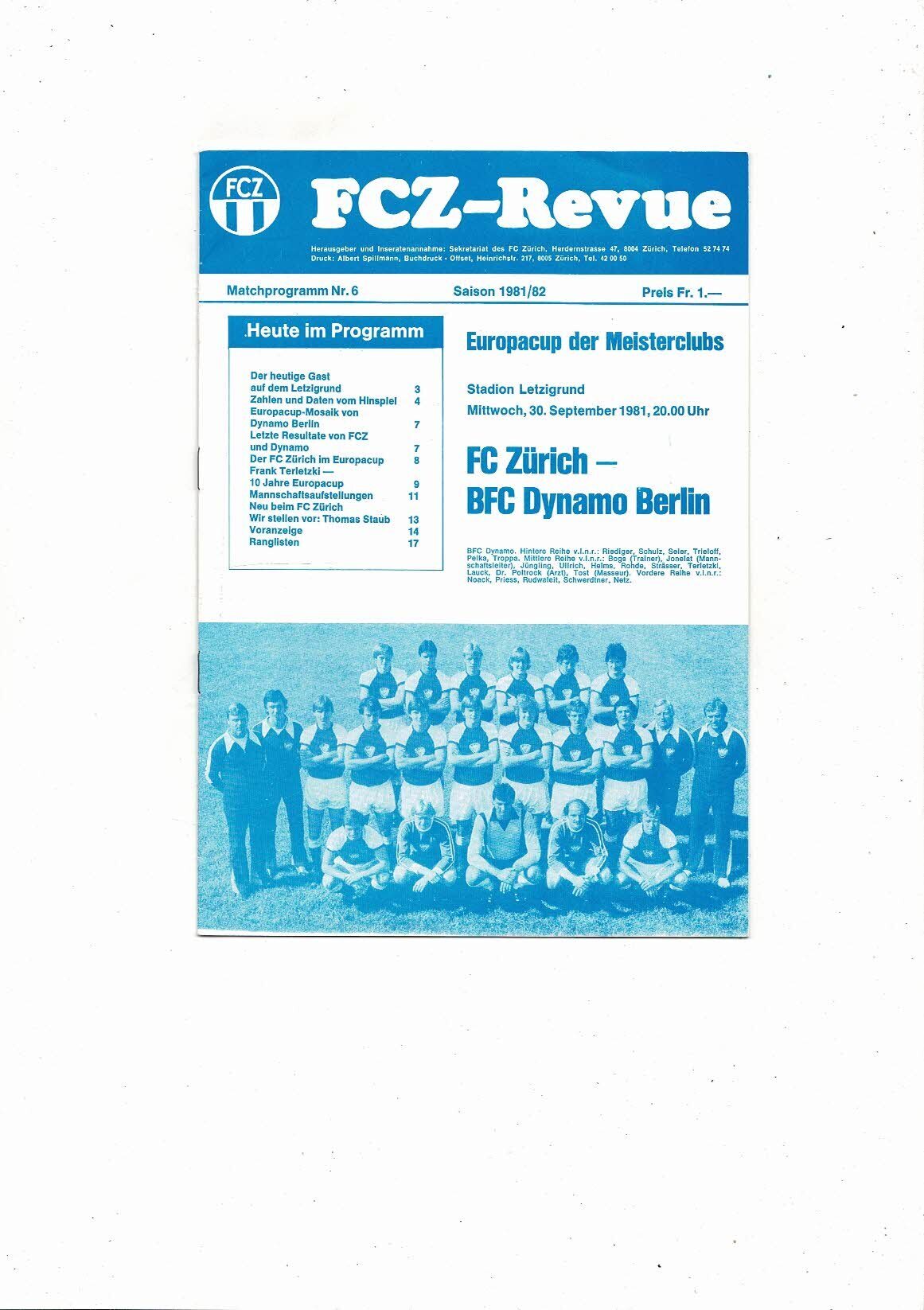 FC Zurich v FC Dynamo Berlin European Cup Football Programme 1981/82
