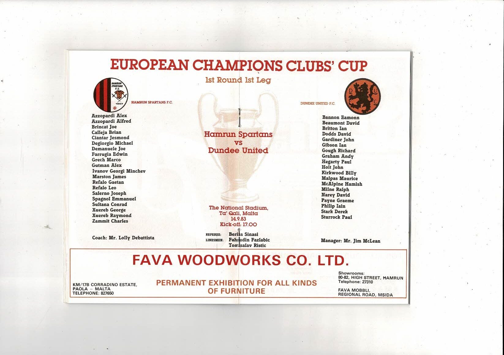 Hamrun Spartans v Dundee United European Cup Football Programme 1983/84