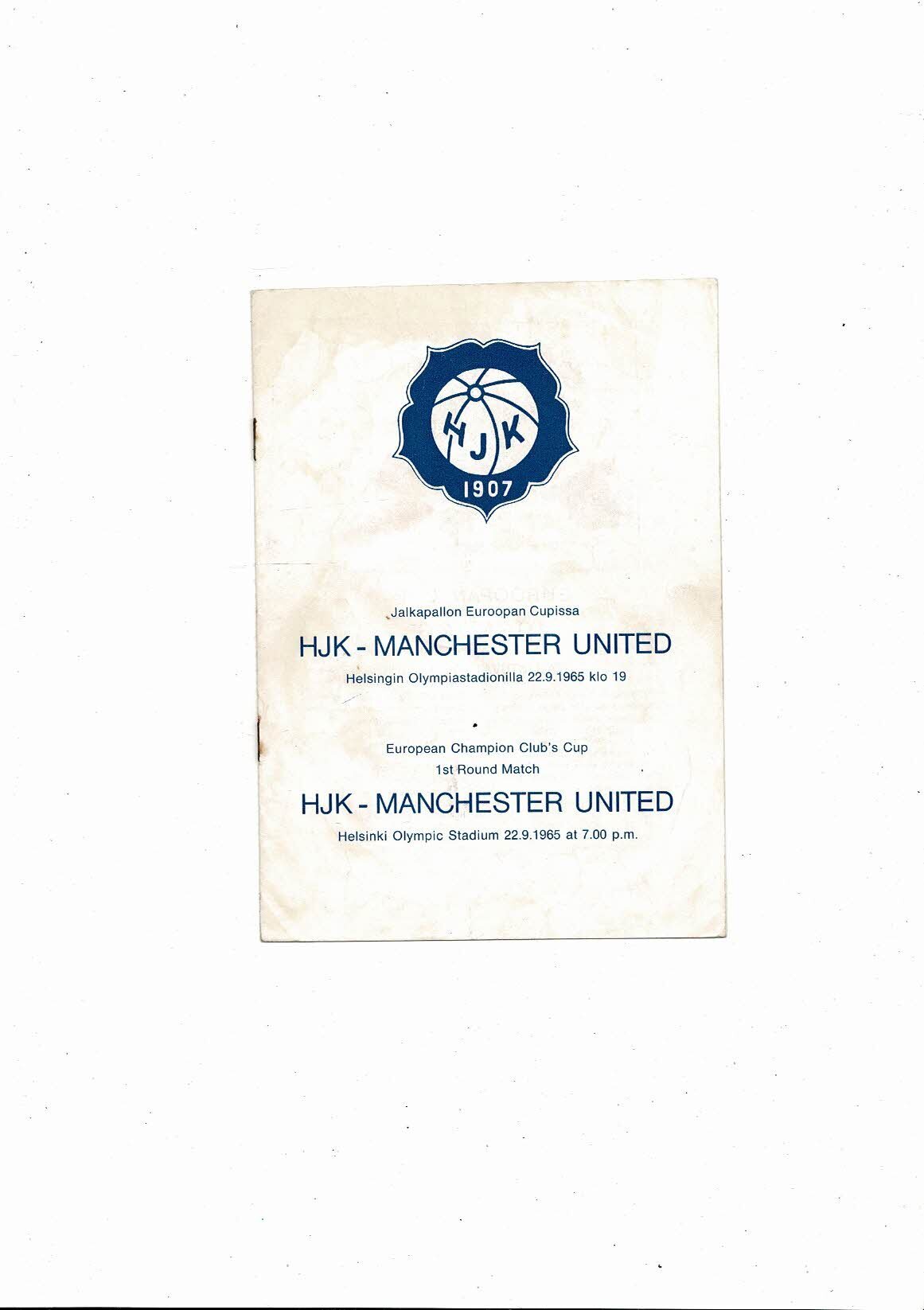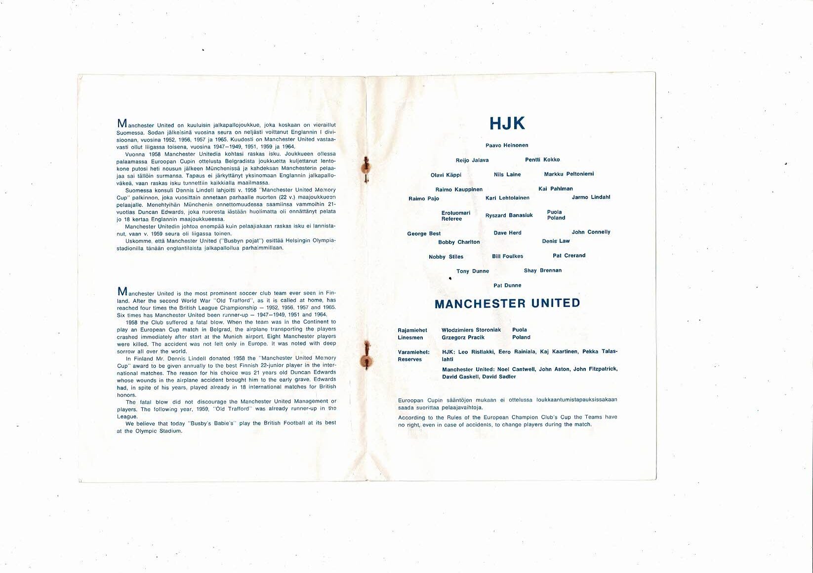 HJK Helsinki v Manchester United European Cup Football Programme 1965/66