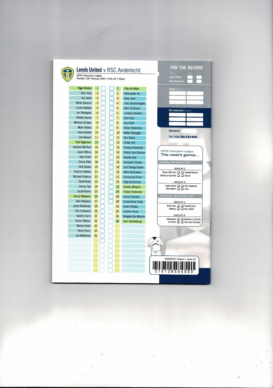 Leeds United v RSC Anderlecht Champions League Football Programme 2000/01
