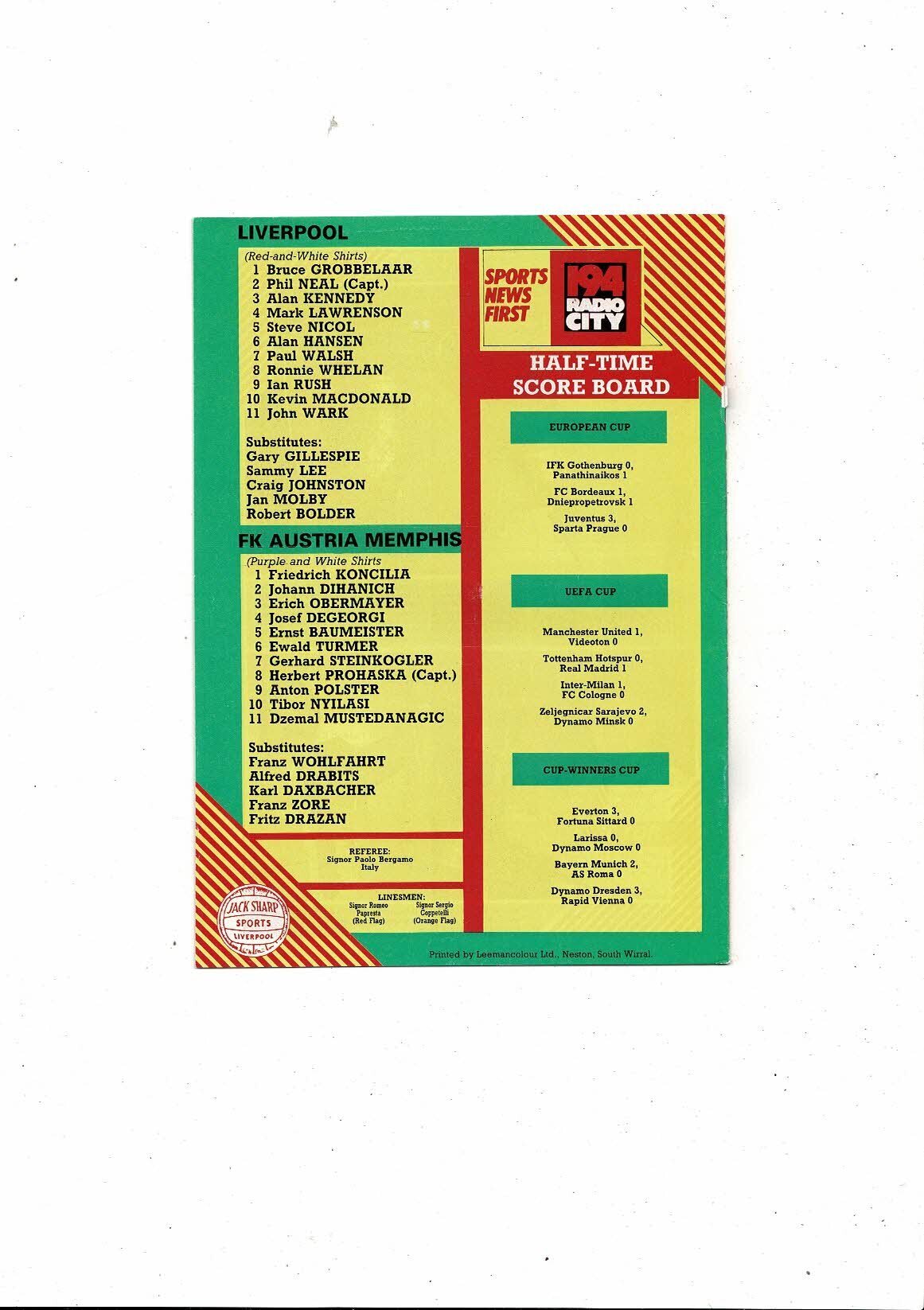 Liverpool v Austria Memphis European Cup Football Programme 1984/85