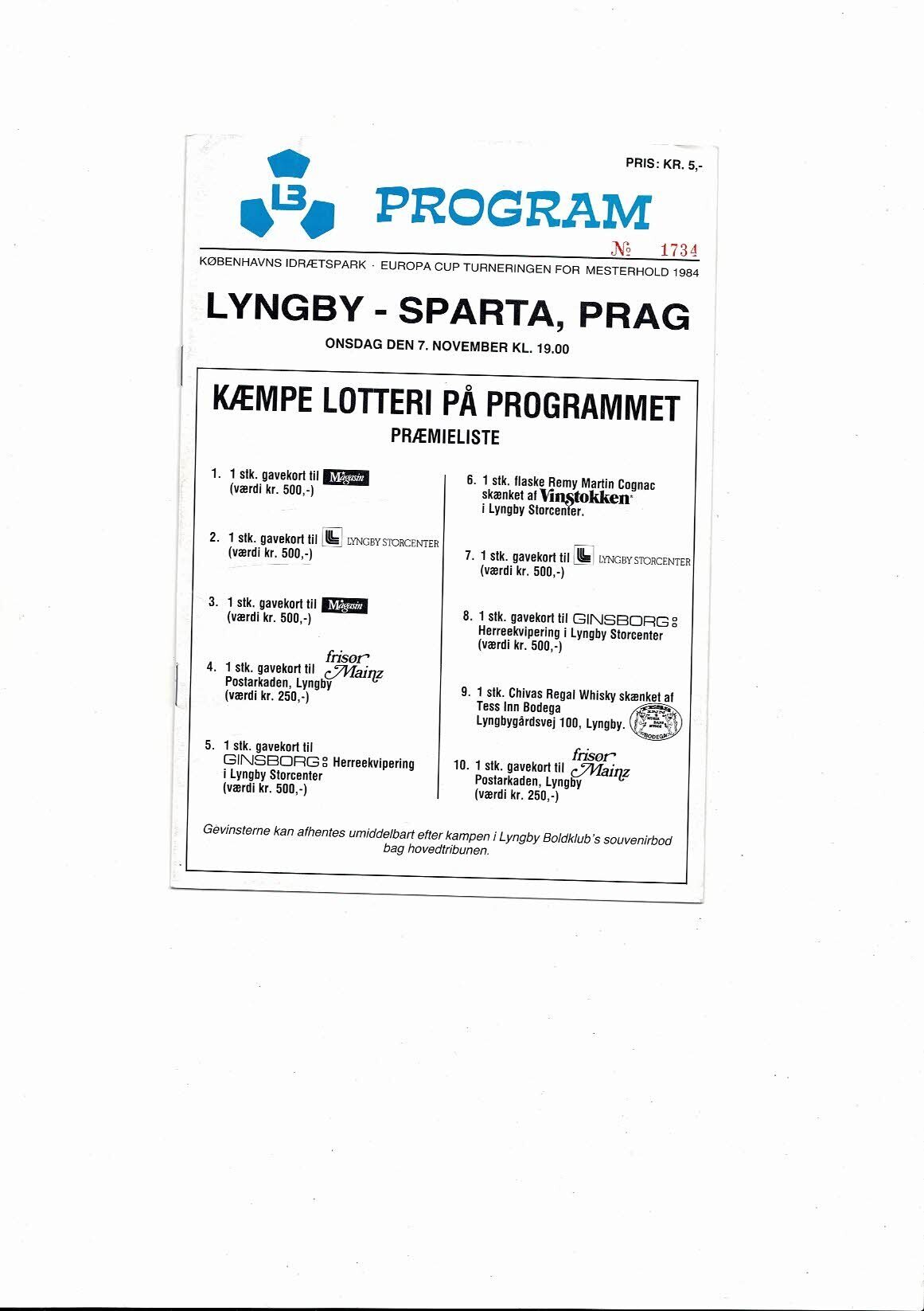Lyngby v Sparta Prague European Cup Football Programme 1984/85
