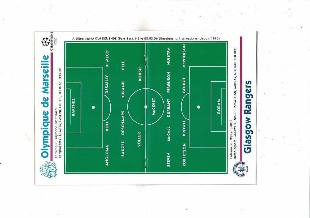 Olympique De Marseille v Glasgow Rangers UEFA Champions League Football Programme 1992/93