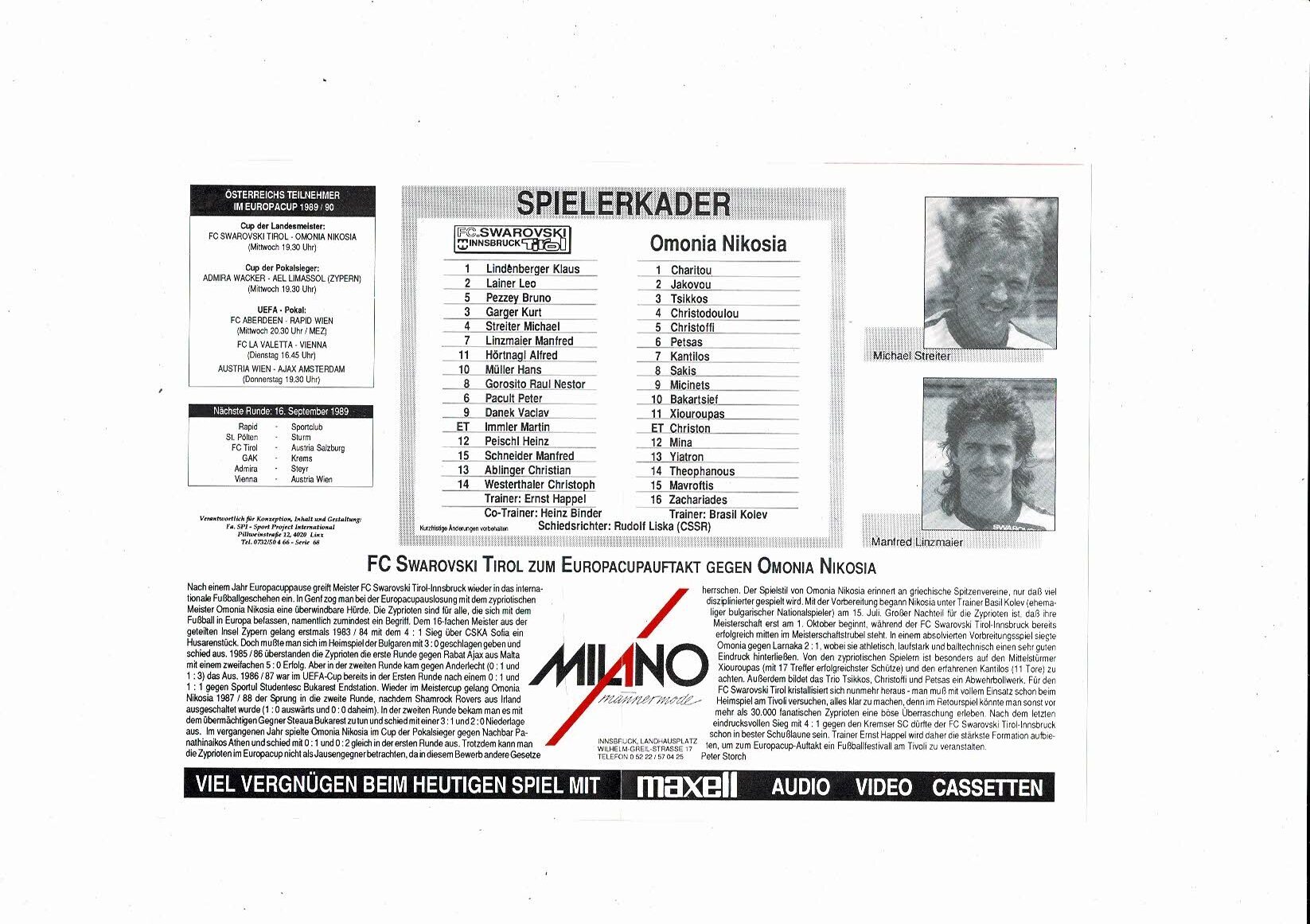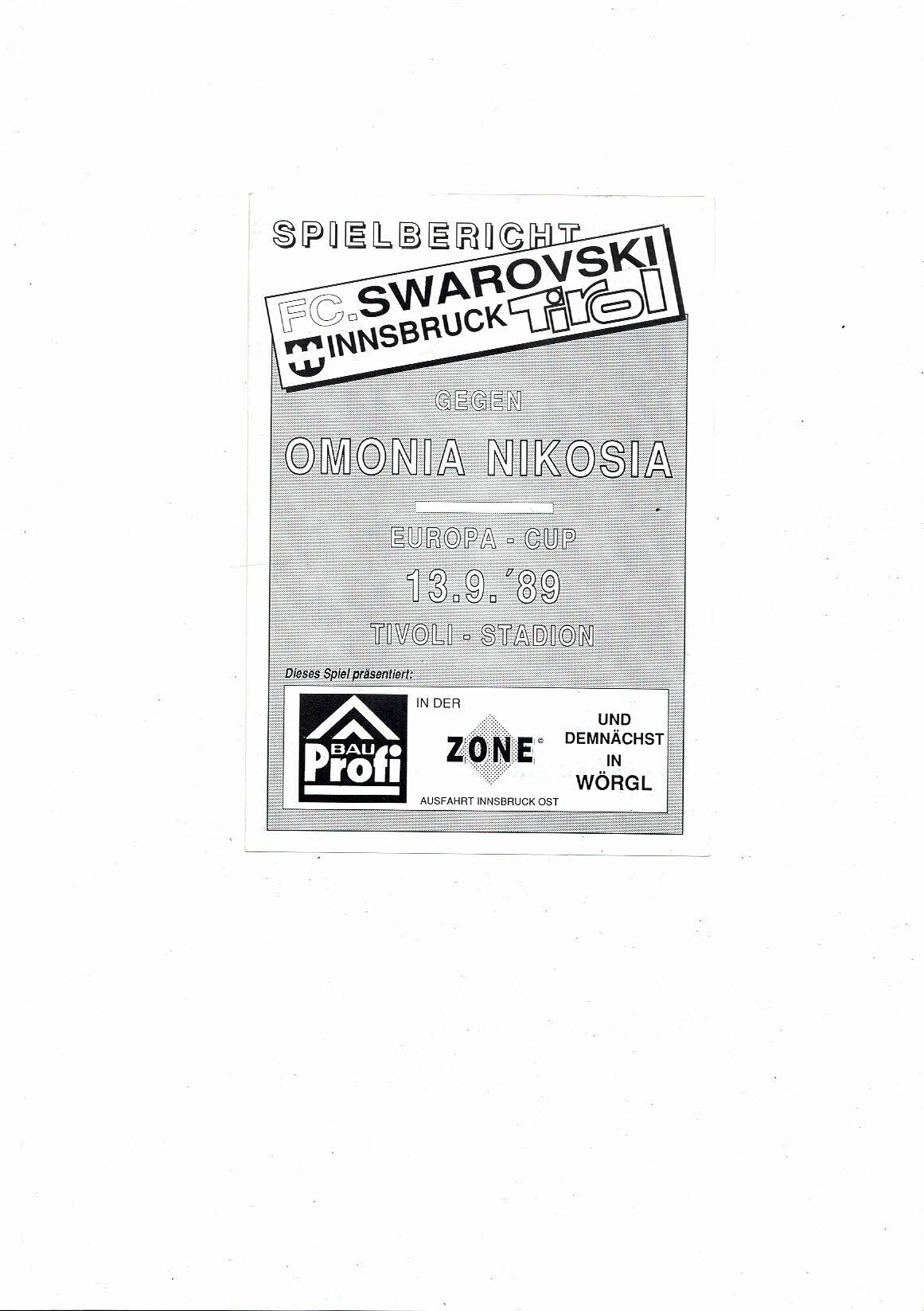 Swarovski Innsbruck Tirol v Omonia Nicosia European Cup Football Programme 1989/90