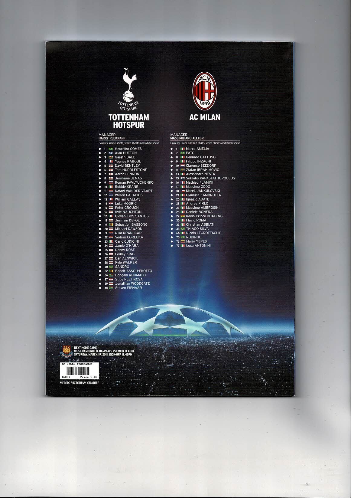 Tottenham Hotspur v AC Milan Champions League Football Programme 2010/11