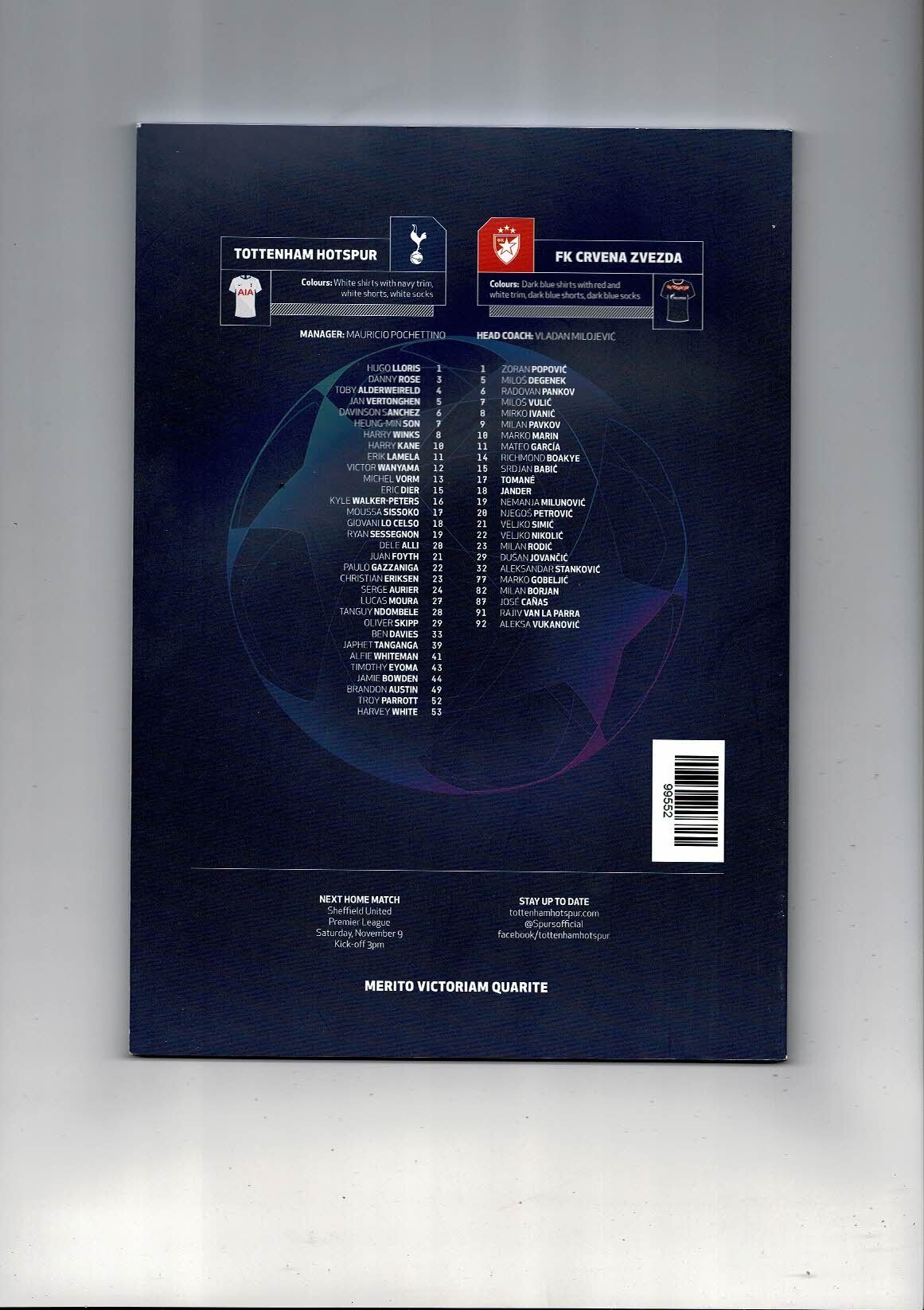 Tottenham Hotspur v FK Crvena Zvezda Champions League Football Programme 2019/20