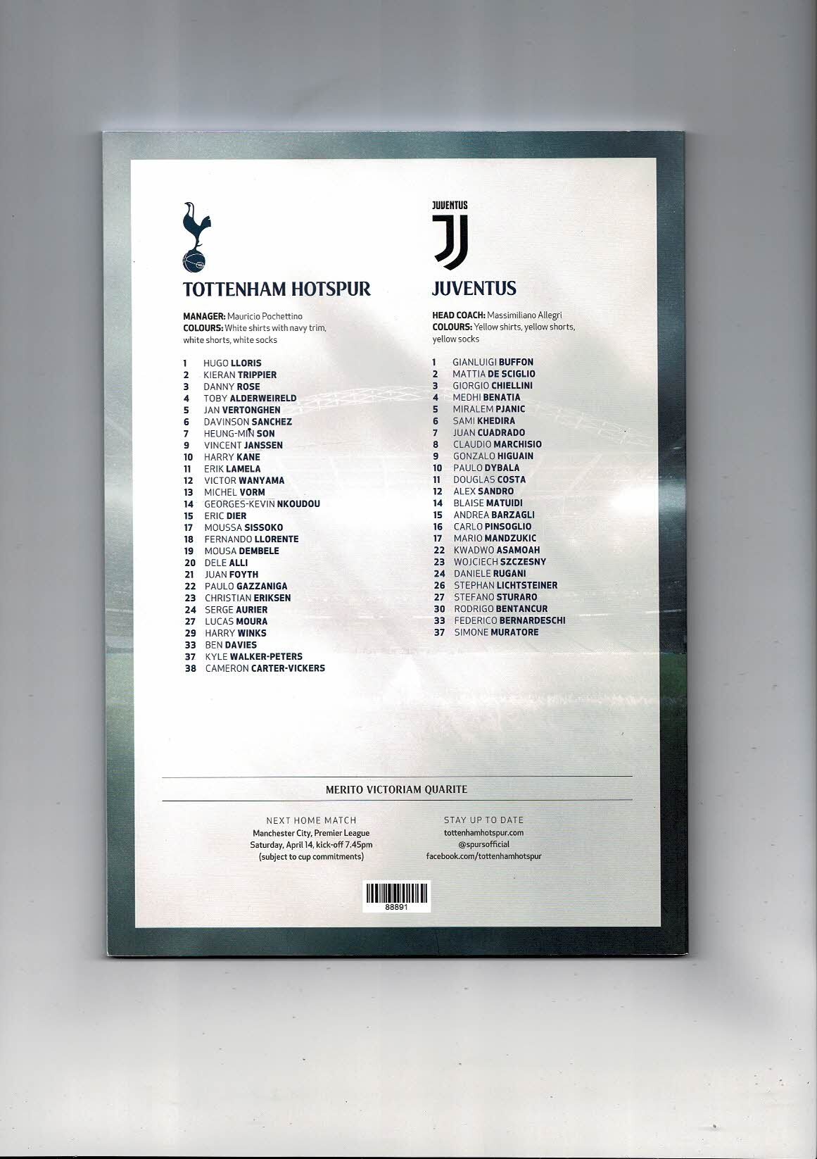 Tottenham Hotspur v Juventus Champions League Football Programme 2017/18