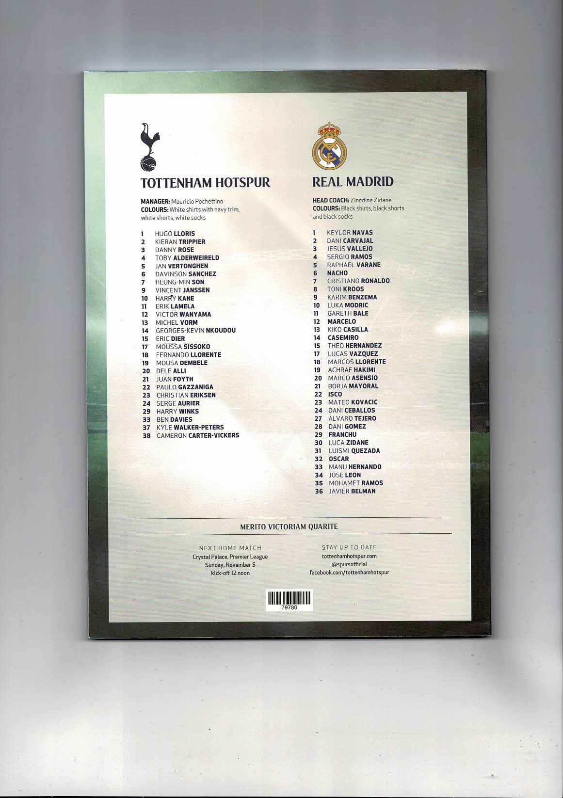 Tottenham Hotspur v Real Madrid Champions League Football Programme 2017/18