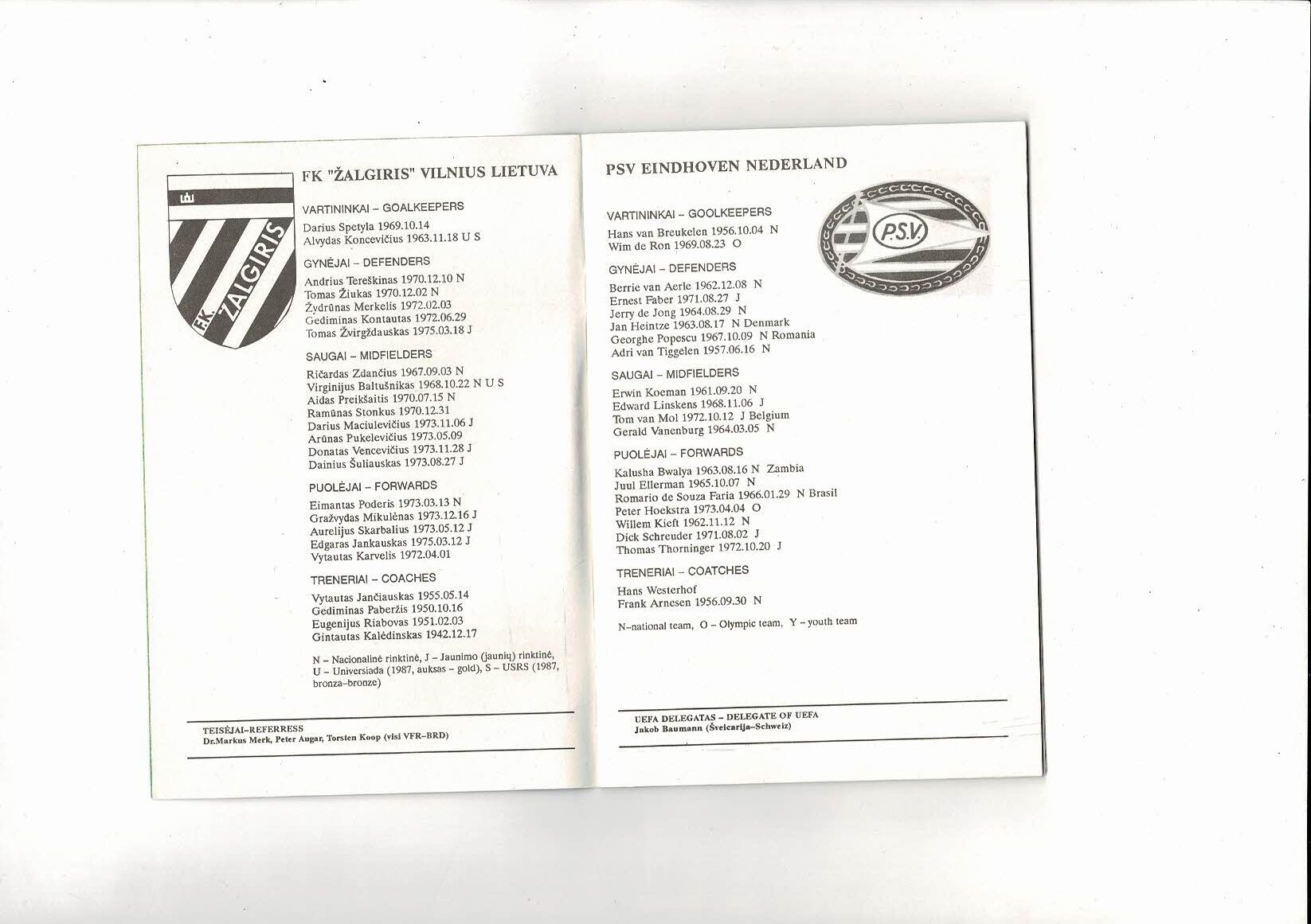 Zalgiris v PSV Eindhoven UEFA Champions League Football Programme 1992/93